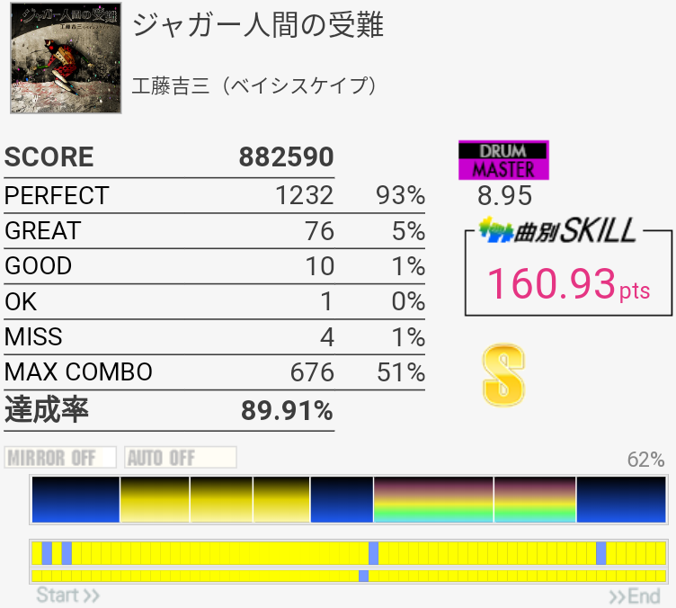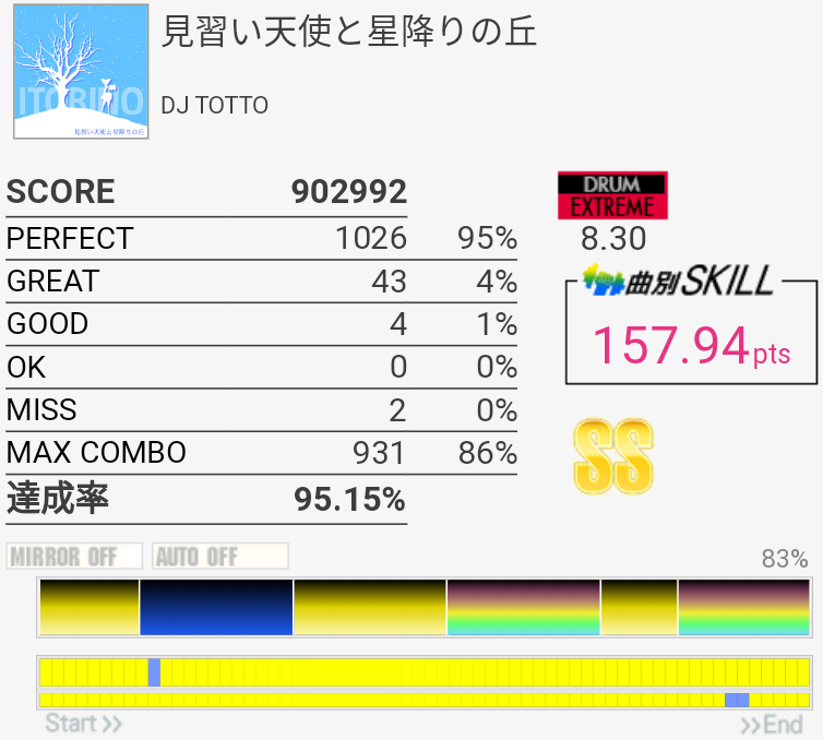 4フレーズ目までグレ7個くらいだったのにLP踏めなくて切っちゃった。あとHH二連打。でも対象の下の方に入ったし一時期に比べるとわりと余裕持って叩けたのでそろそろ繋ぎたいね。