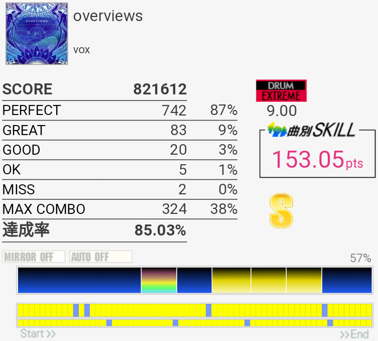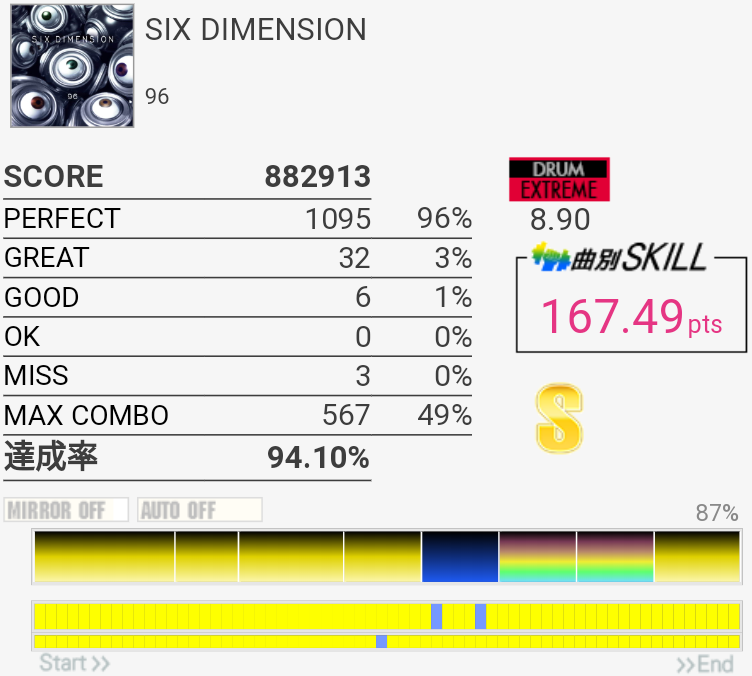 Hot枠が28も上がったおかげでスキル8267.24、金ネーム折り返し(ついでに前作スキル越え)。あとOther枠が下限167になった(平均169ちょい)。タム回しに対する苦手意識も薄れてきたというかちょっとずつ伸びてる実感があるのでまた楽しくなってきたというか。今作虹ネームはまだ無理かなって感じだけどとりあえずOther枠あと11上げて平均170にして、Hot枠も低すぎるのでせめて下限160……このスキル帯では前作より全然伸ばしやすいはず……。