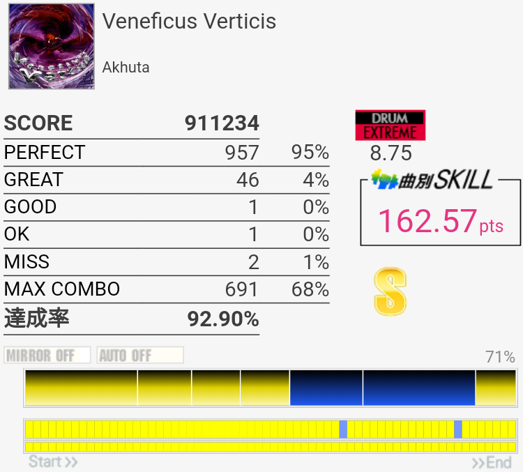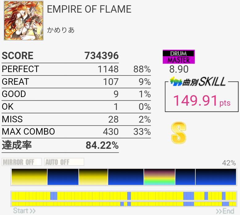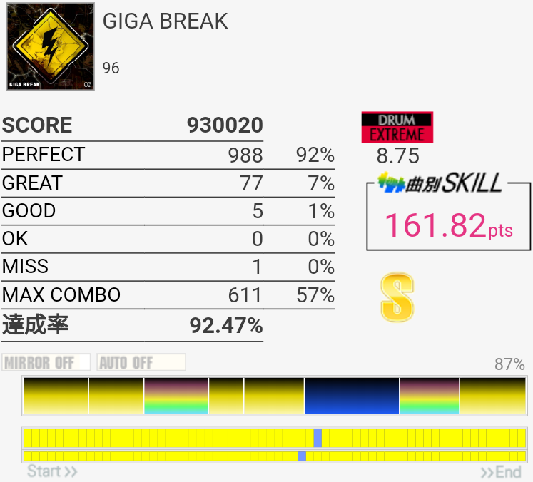 5フレーズ目のタム叩けたのに左手SN二連打で外れてしまった。いつになったら繋がるのか。