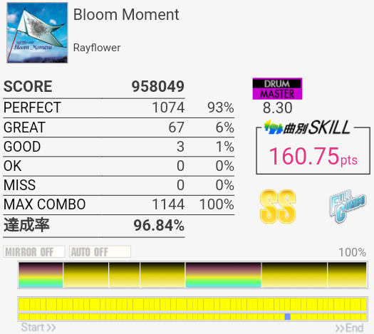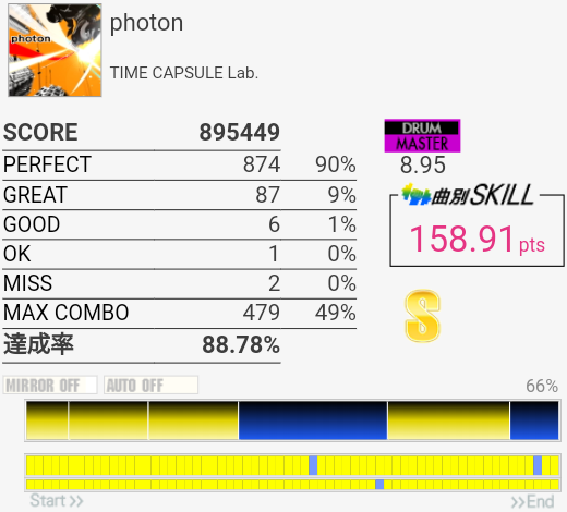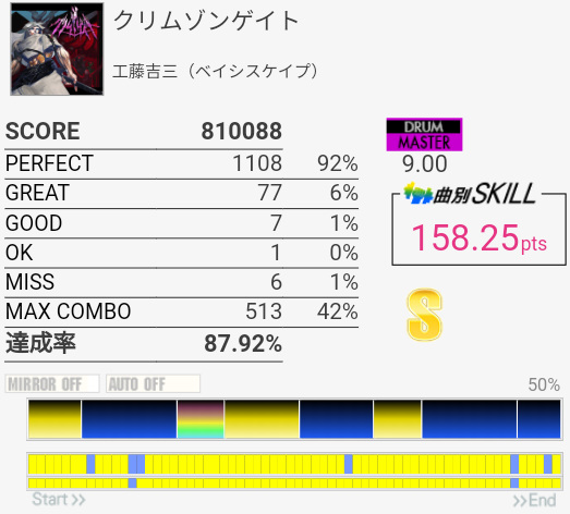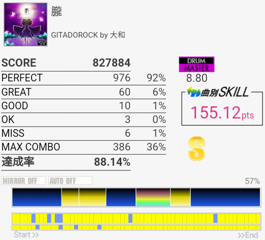 この曲なんか叩いたのに反応しない、ってのが多いんだよな(叩けてない)。ちなみに今回は2フレーズ目でHTとLTを盛大に叩き間違えた。