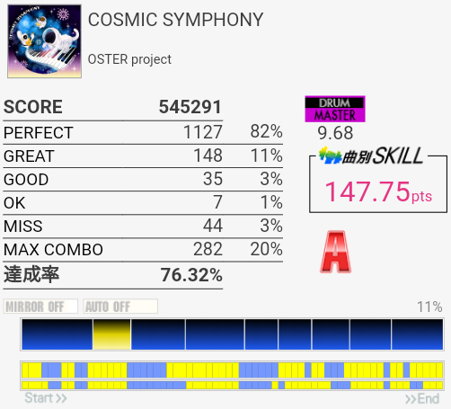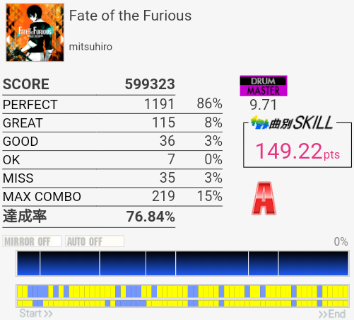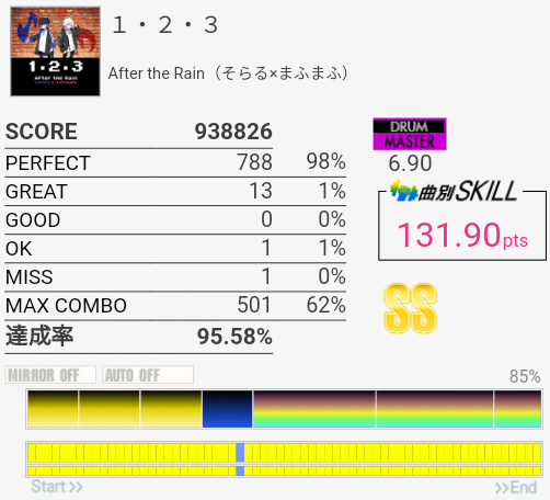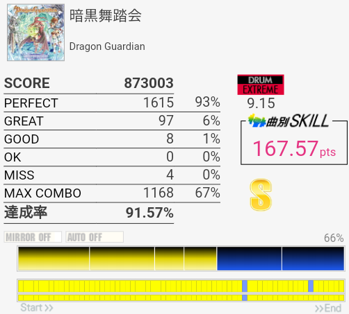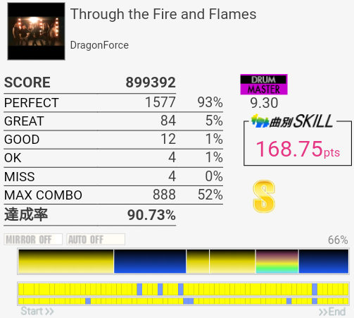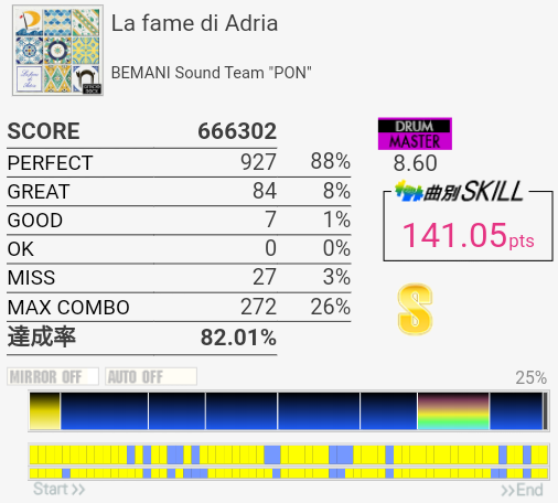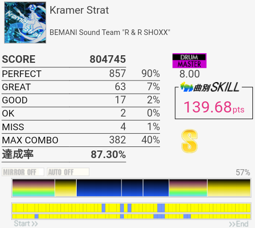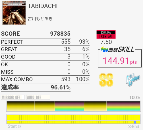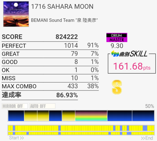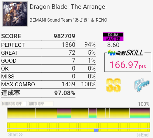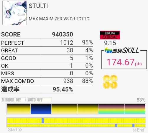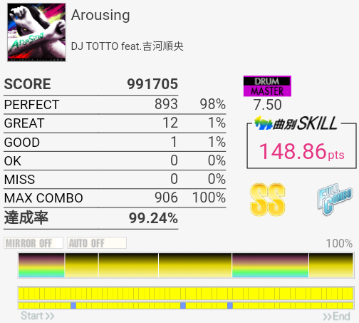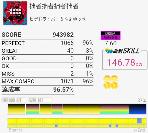 SS取得。右腕がサビくらいで限界だったけど根性で動かして最後の最後でHHが跳ねなかったというかMISSなの?ちゃんと叩いたは叩いた記憶あるんだけど。まあ二度とやんないからどうでもいいな。