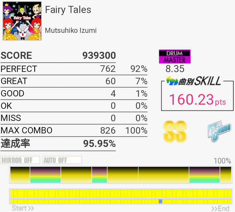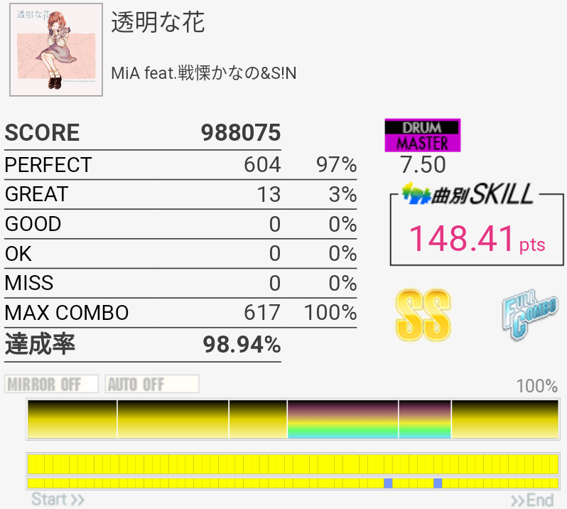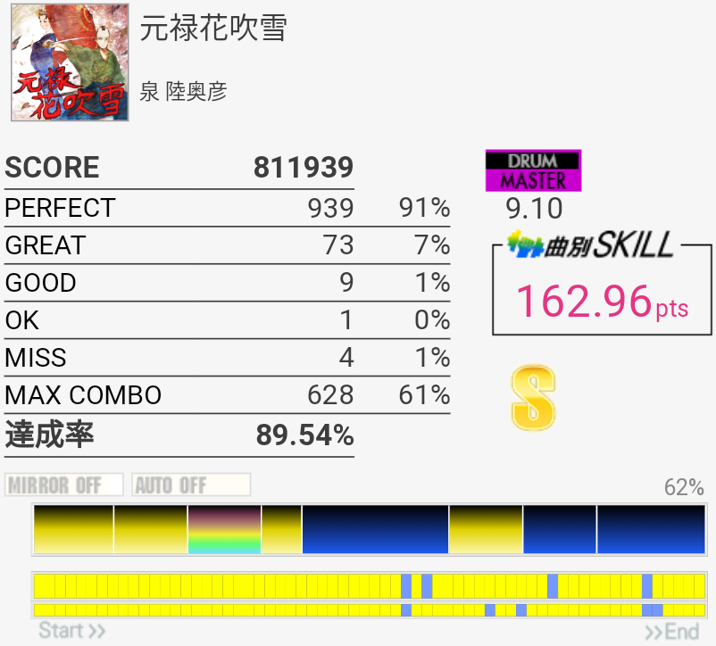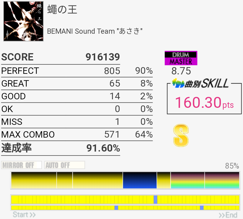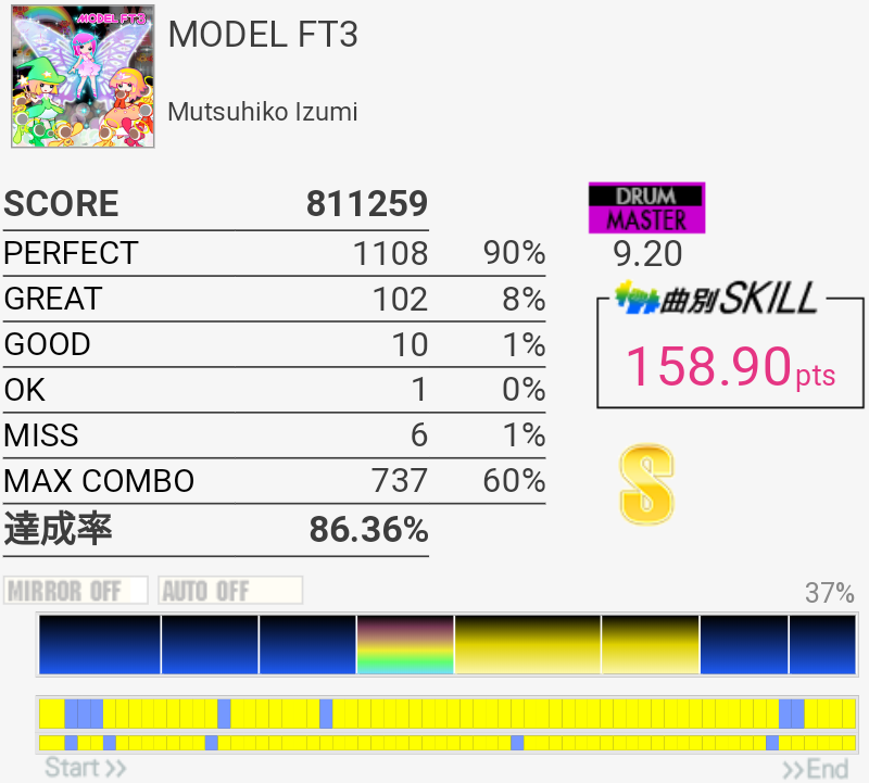 右手LTダブルはけっこう入れられるようになってるのかな、相変わらず余裕はないけど。SNが反応しづらい感があって今日は変なミスが多かった。SNの奥の方を叩いていたのかもしれない。
