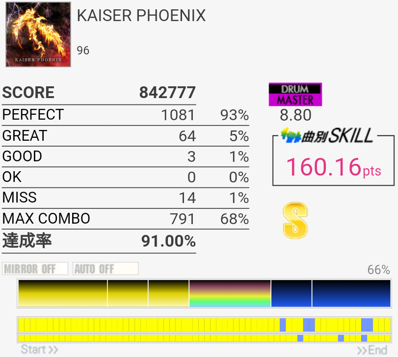 すごく久しぶりにやってフルコン。連BPもEMPIRE OF FLAMEとかに比べたら全然楽だな。CYがちょっと浮いてるせいで感覚わからなくてパフェ率落ちたけど170点取れたからよし。