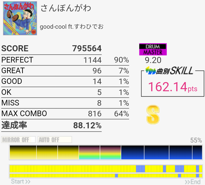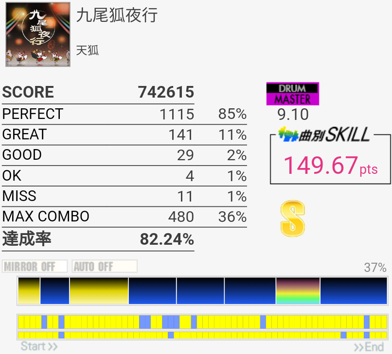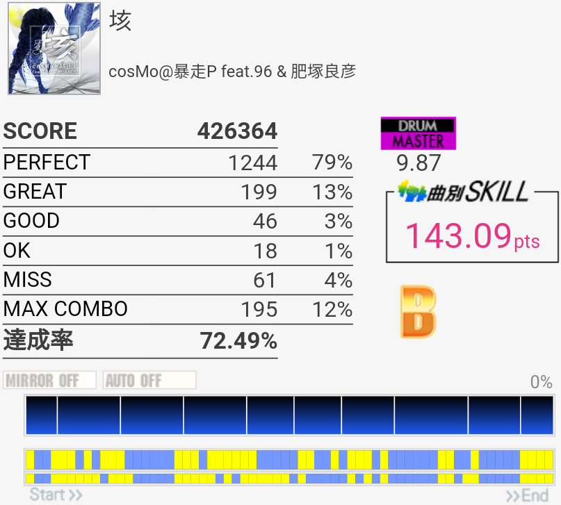 譜面忘れてたのでどんなんだったっけ?って思って選曲した。エグいね!最後らへん腕が動かなくなってて普通に落ちかけた。