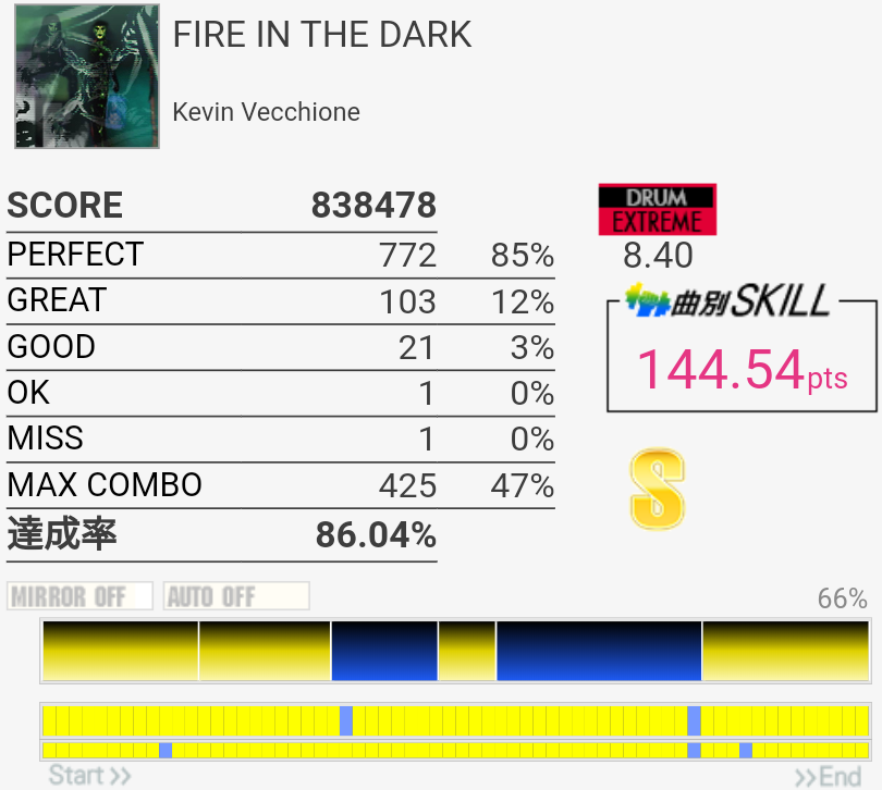 これもやるの久しぶり。後半のシンバルタムは動き自体はちゃんとできたけどパッドの真ん中を叩けなくてMISSになった感じ。前に比べたら全然いいのでちゃんとやっていこう。