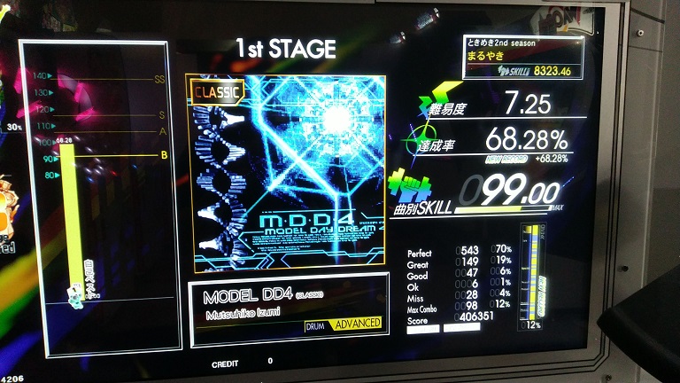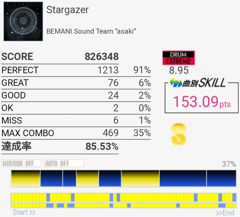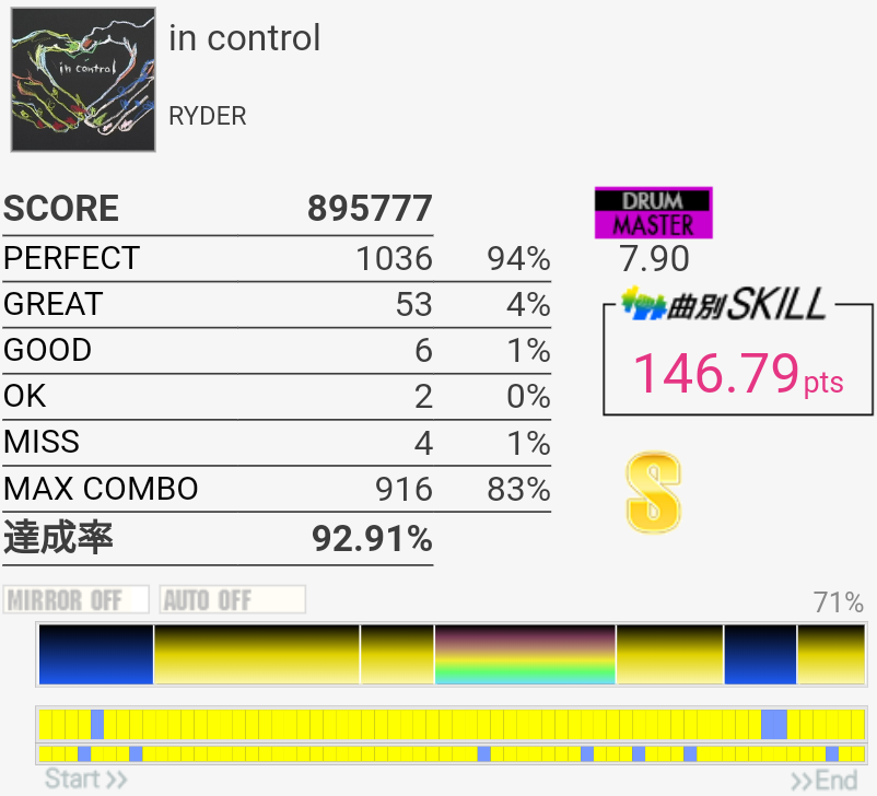タムうぜー(笑)EXT譜面は叩きやすく配置変わってるのに。最初と最後の16分SNとタムが絡むところは右入りだと回らないかな?SNとかめちゃめちゃ音余ってる感じだしもうちょい増やして難度値上げてよかったのでは。