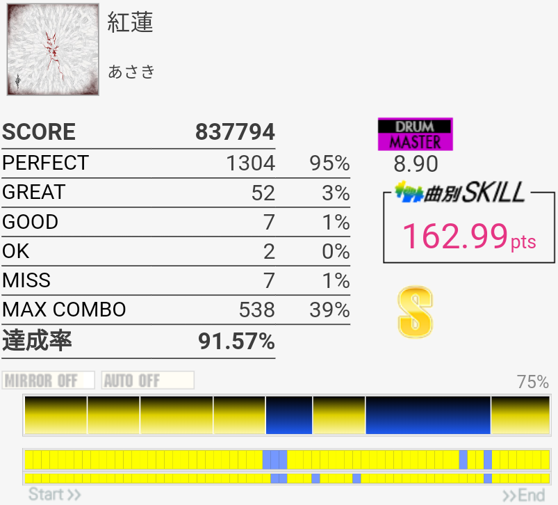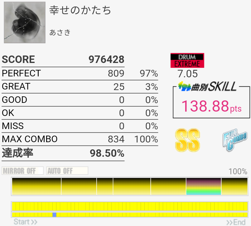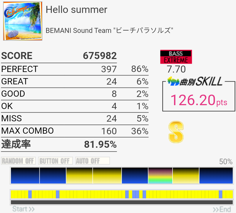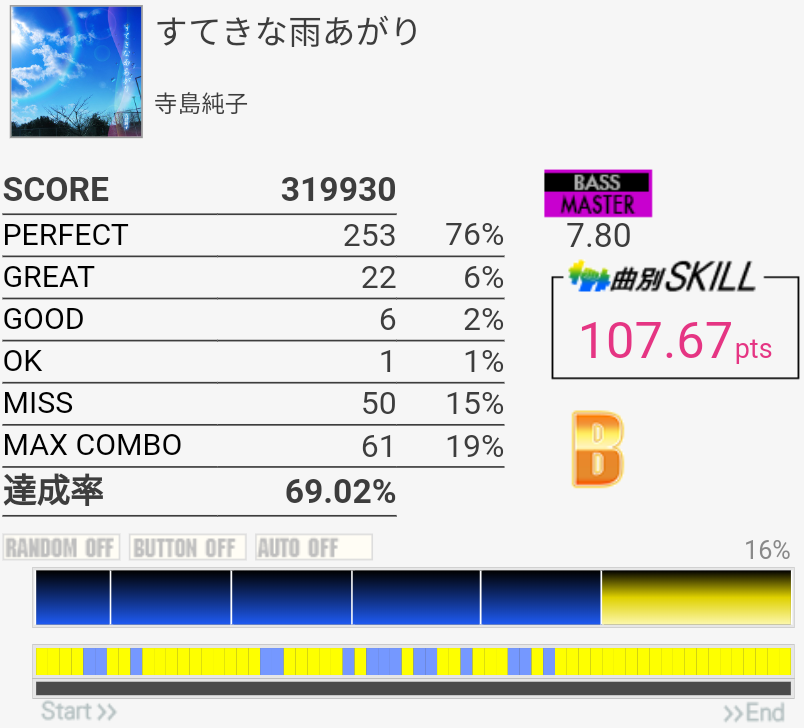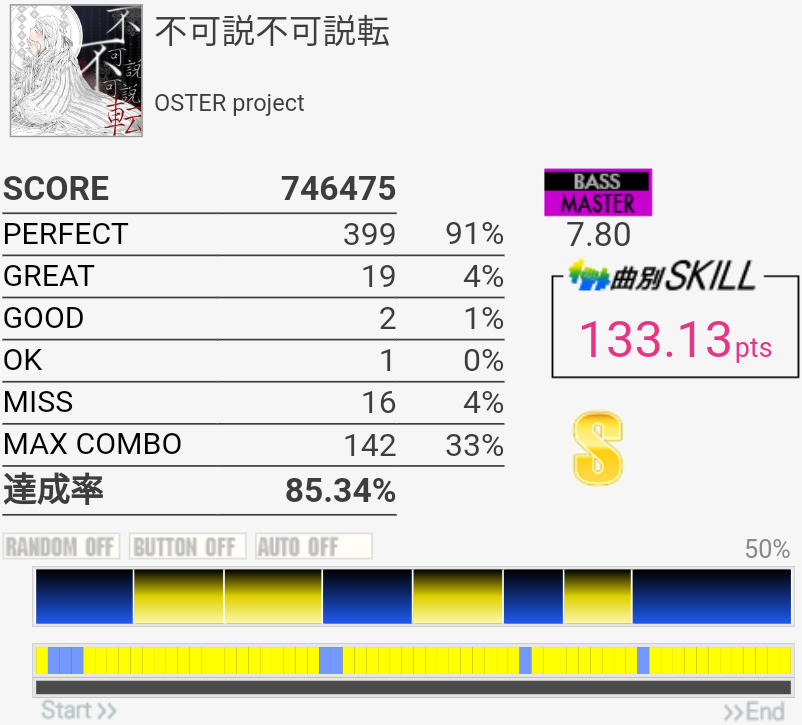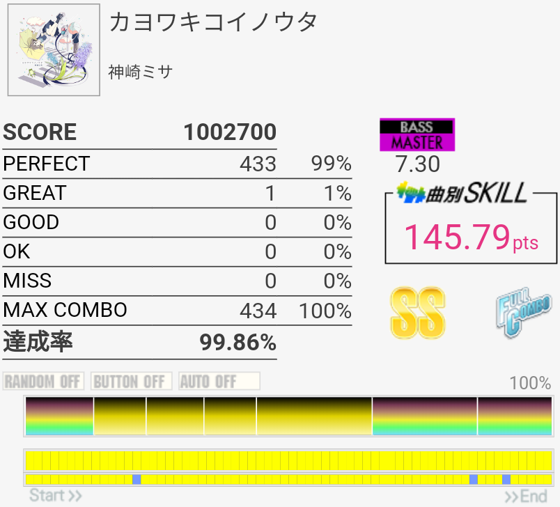 これもパフェ率低いけど過去一うまかった。5フレーズ目の最初で謎の無反応がなきゃなー。3フレーズ目のあそこはマジで繋がらん。
