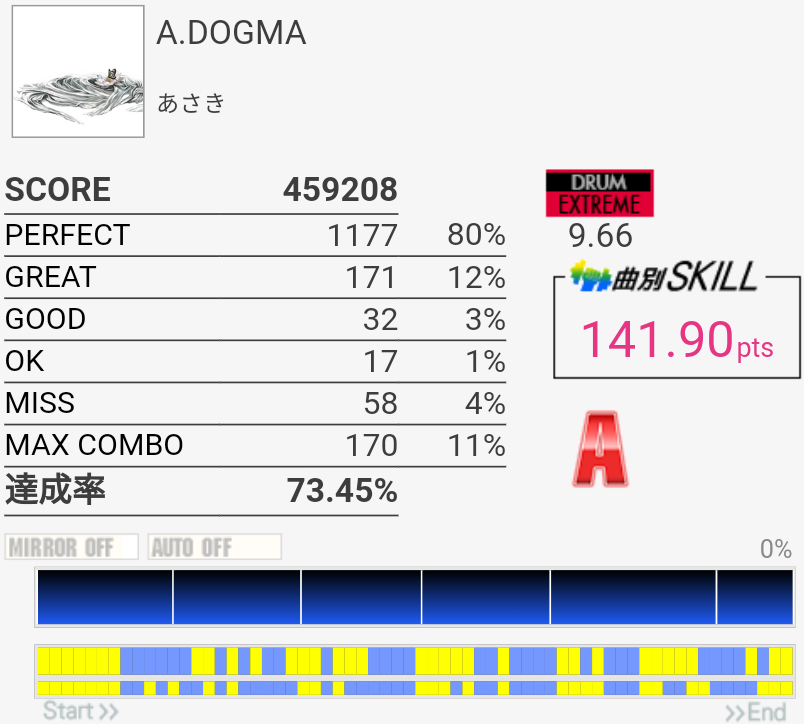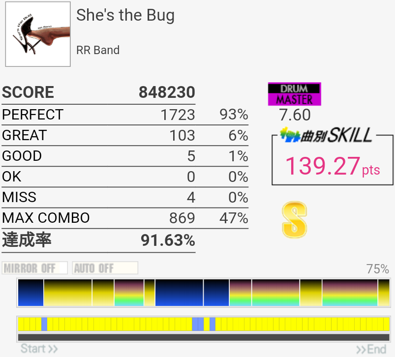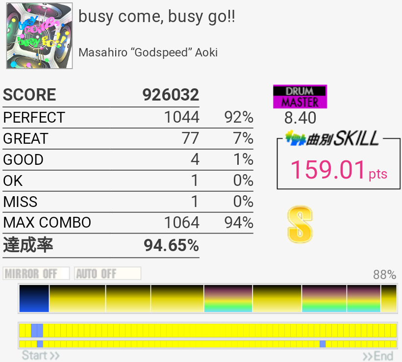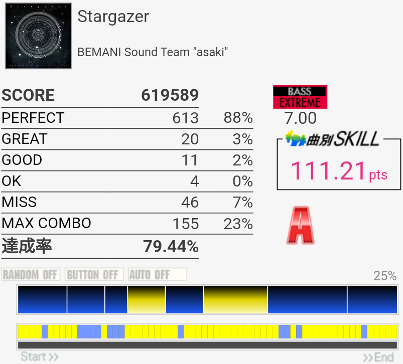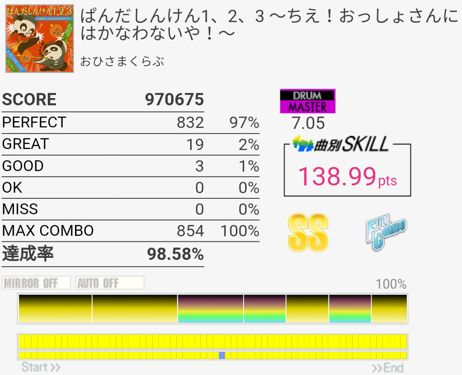 これもパフェ率低いけど過去一うまかった。5フレーズ目の最初で謎の無反応がなきゃなー。3フレーズ目のあそこはマジで繋がらん。