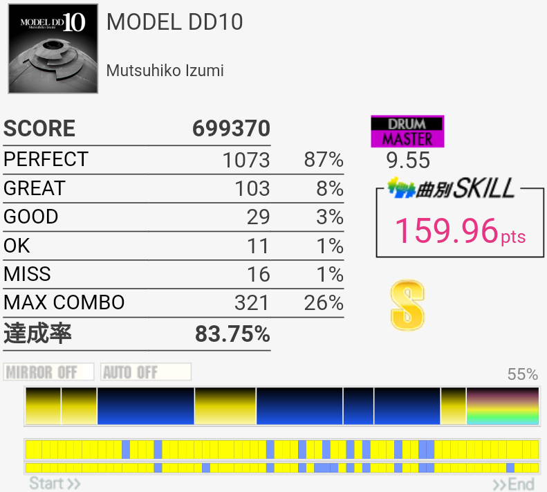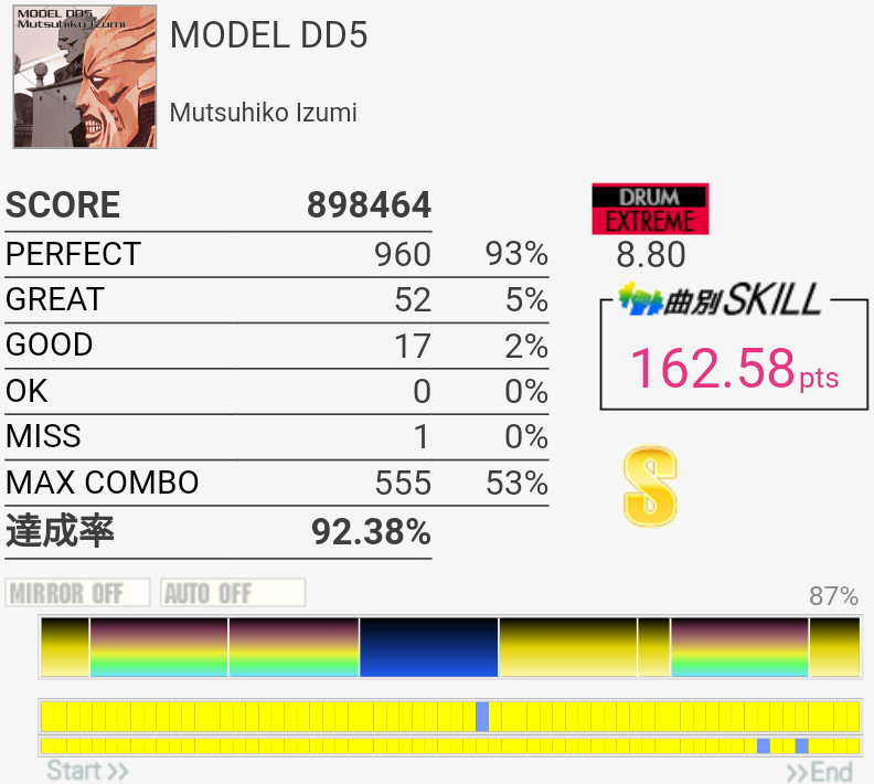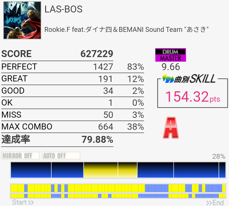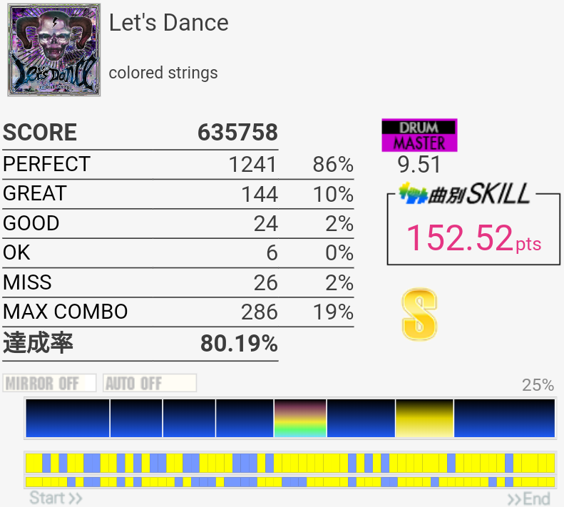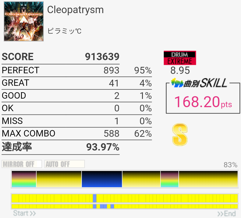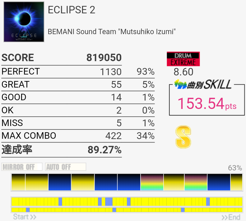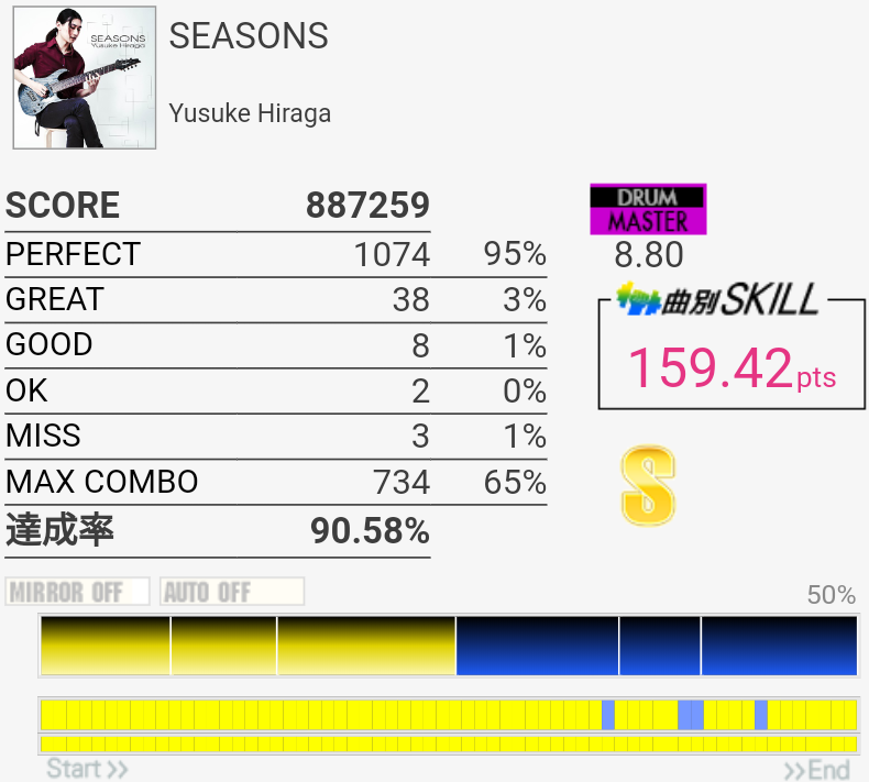 S取得&対象入り……!マジで?3フレーズ目の入りと最後のツーバスでCYが多重反応しなければって思っちゃうけどまあ、まあ。2フレーズ目のHHを左手で全部叩けたのが強い。