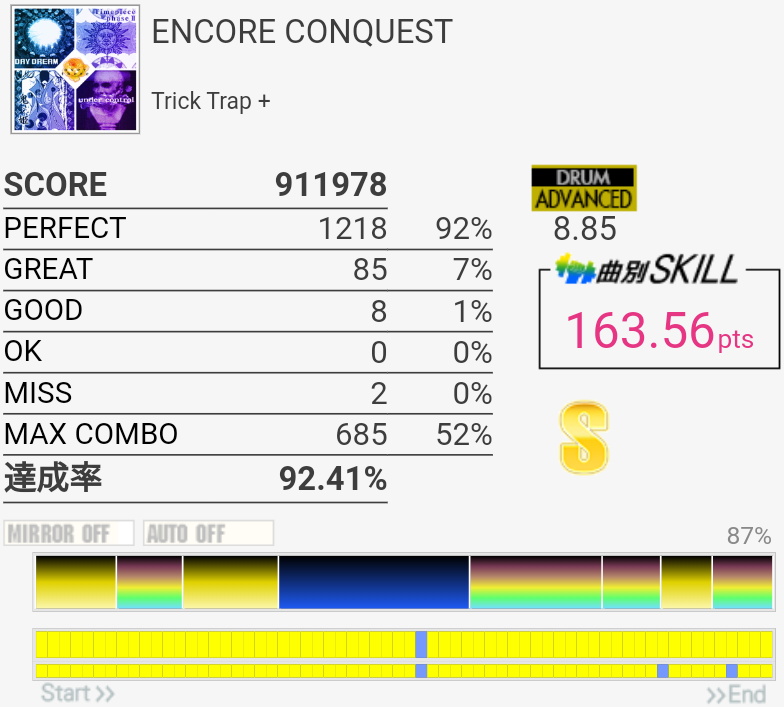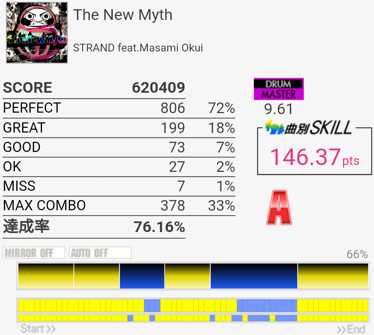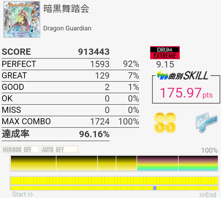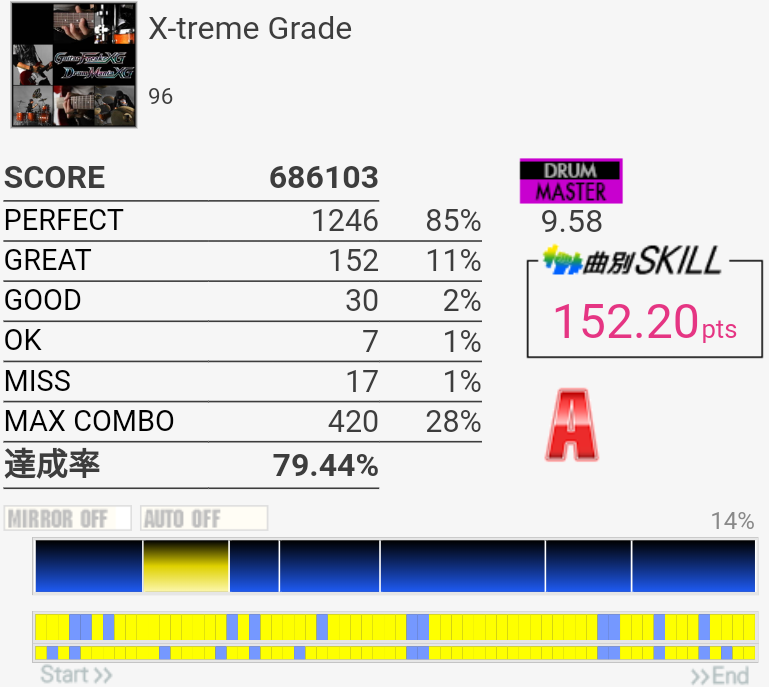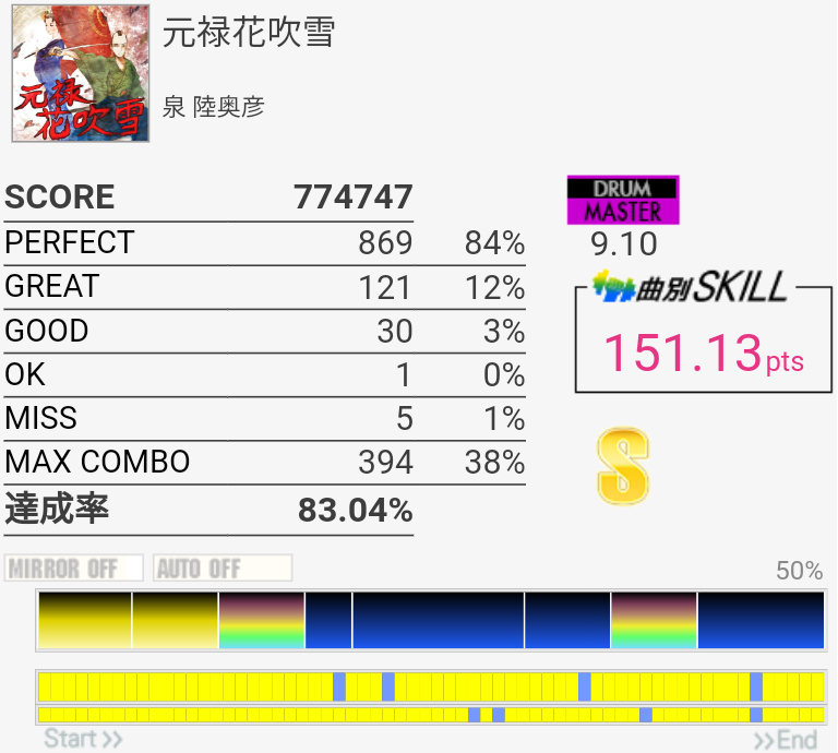 手が前よりかは動くようになってるからSは取れそう……でもクリアメーターの感じはあんま変わってないな。三連符SNからのタムがちゃんと取れるのはいつになるのやら。
