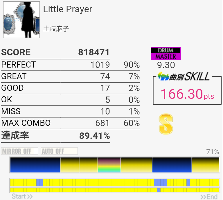 対象入らないとか言ってごめん!めちゃめちゃ稼げる曲でした。最後はフルシングル・フルダブルだと手順に無理が生じるので適度に混ぜなきゃいけないけどよくわかんないな。途中で左手表拍に切り替えたりするのかな。確認してないけど。