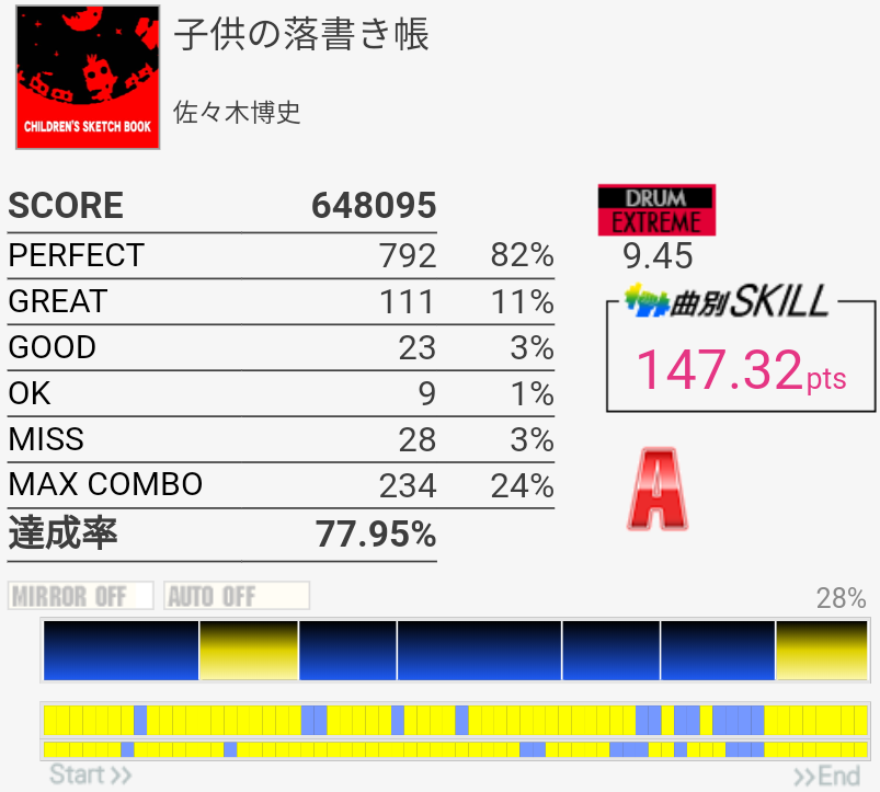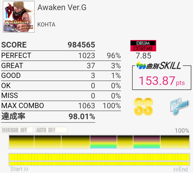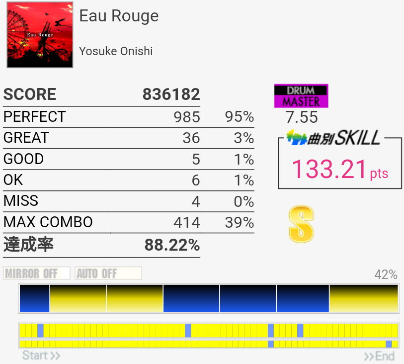 調子が最低の時のリザルト。HH叩いてるはずなのにMISSだしCY全部GREATだしサビのLT反応しないし。調子にムラがありすぎて自分と筐体のどちらが悪いのかわからん。普通のゆったりとしたHH刻みでGREAT出るからおかしいはおかしいと思うんだけど8割は自分かな。でもSNは無反応出るから筐体がおかしい。