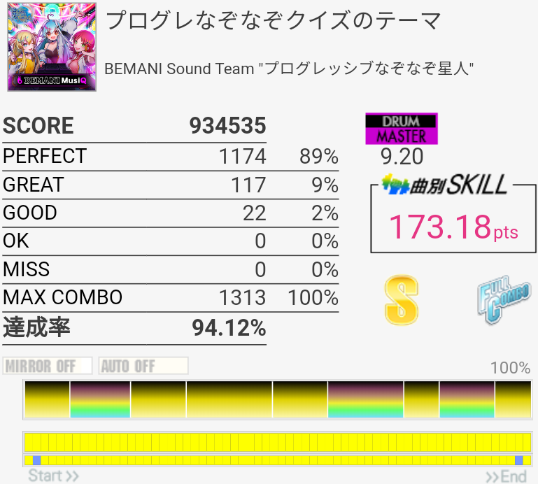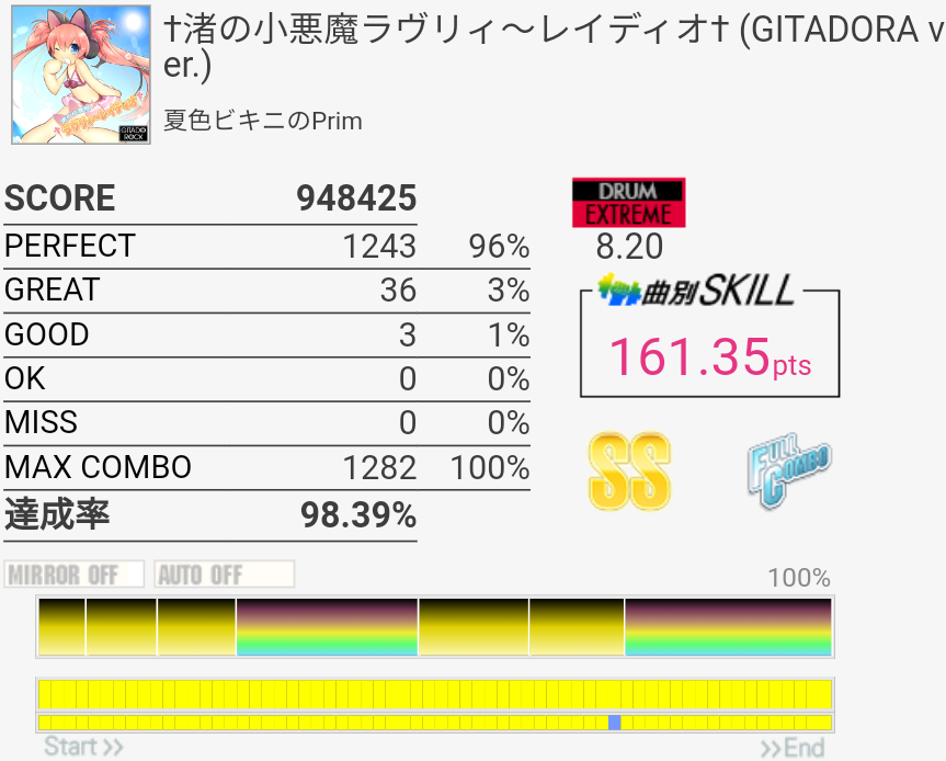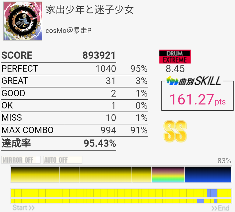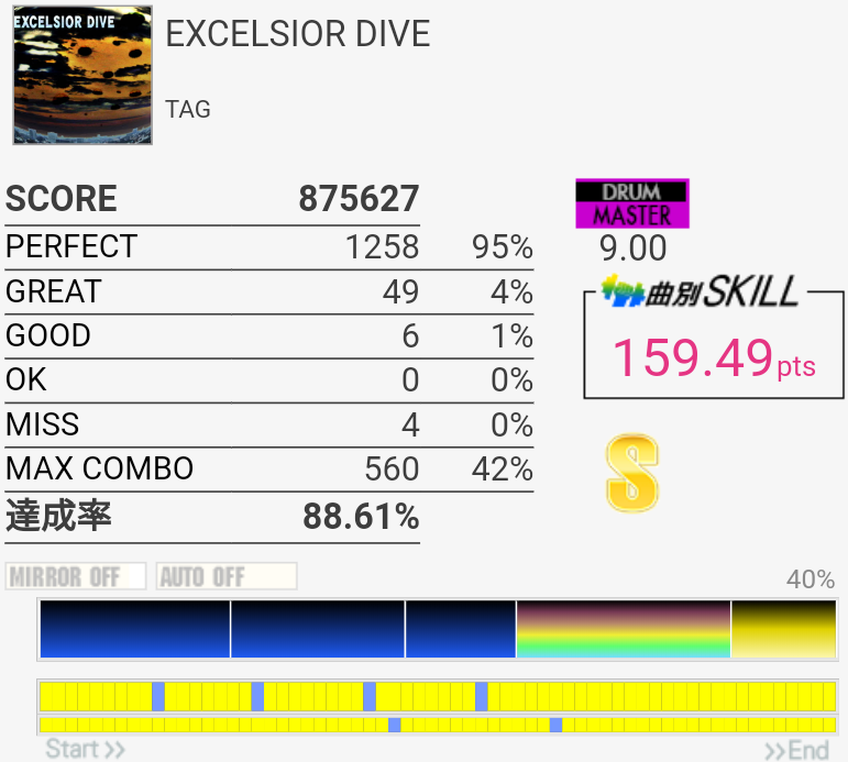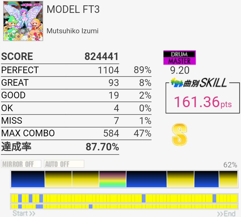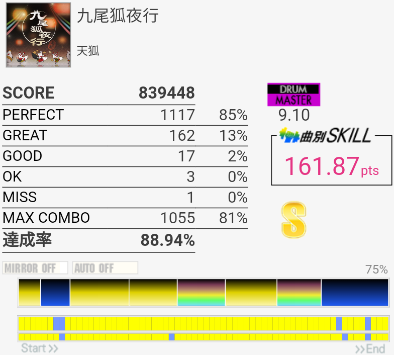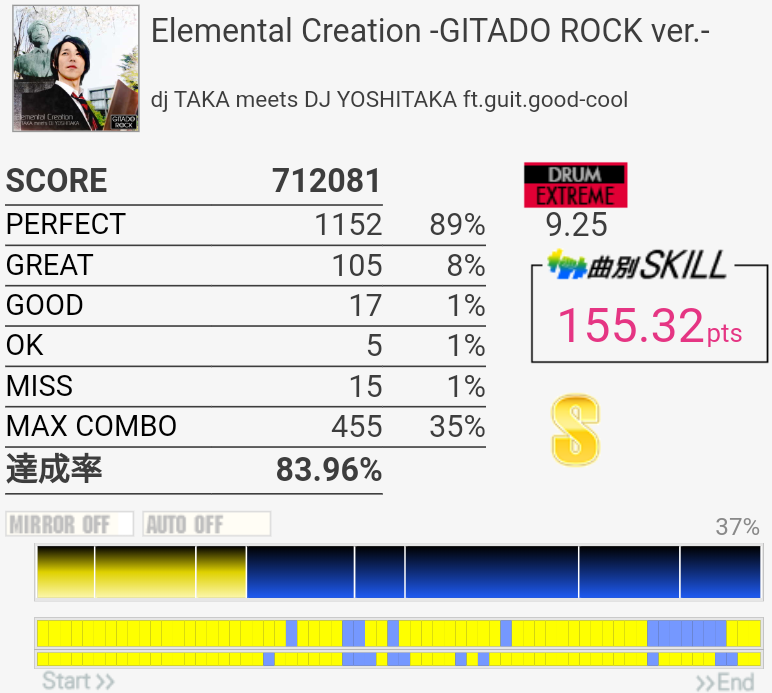 繋がったけど周りが最高潮に騒がしい瞬間だったので曲が聴こえなくてパフェ率が死んだ。一番高くて93%だったから対象トップ狙えるね。一番難しいのは最初の左始動フィルと三連符ツーバスと、そのちょっと後のSN×3→HT×2→LT×2に上手く入れるかで、中盤以降はあんまり切る要素ないかな。曲が聴こえないとテンポ変わった16分HHが合わせられなくなるけど。正直PluviaのEXTの方が難しいような……。