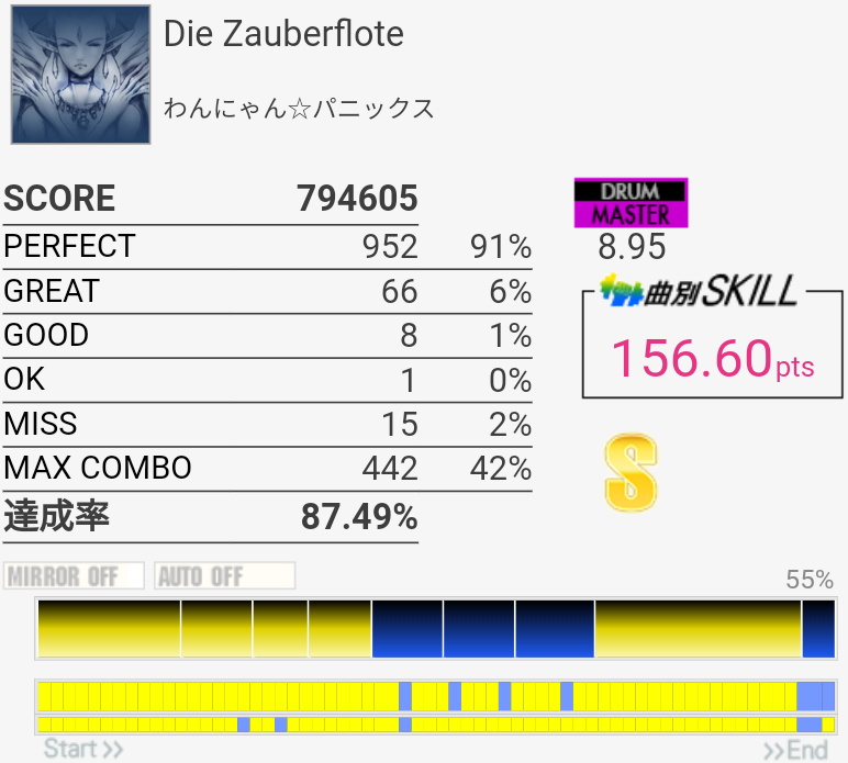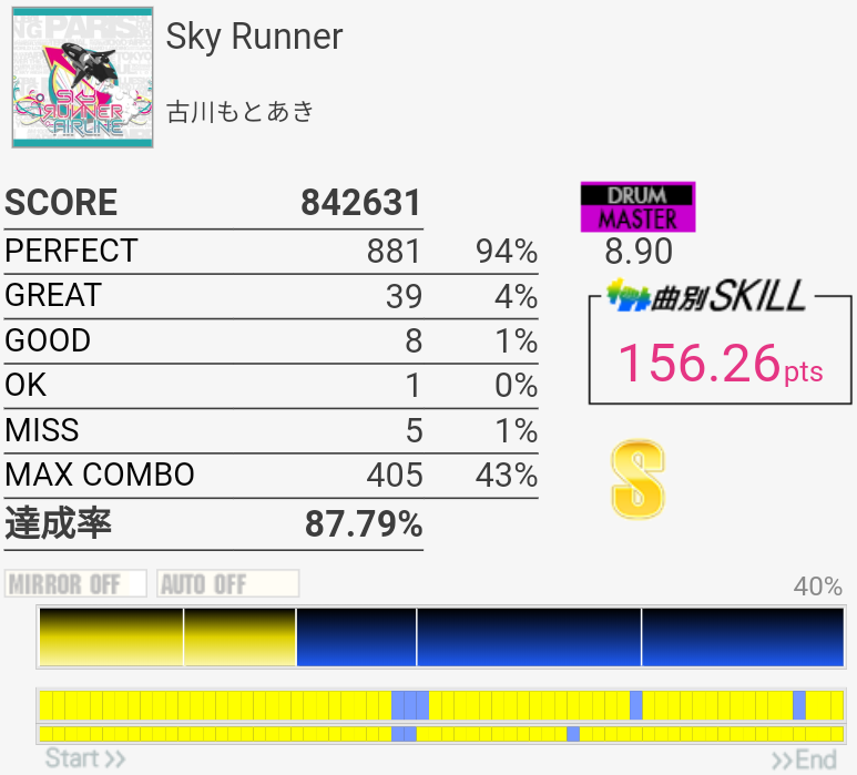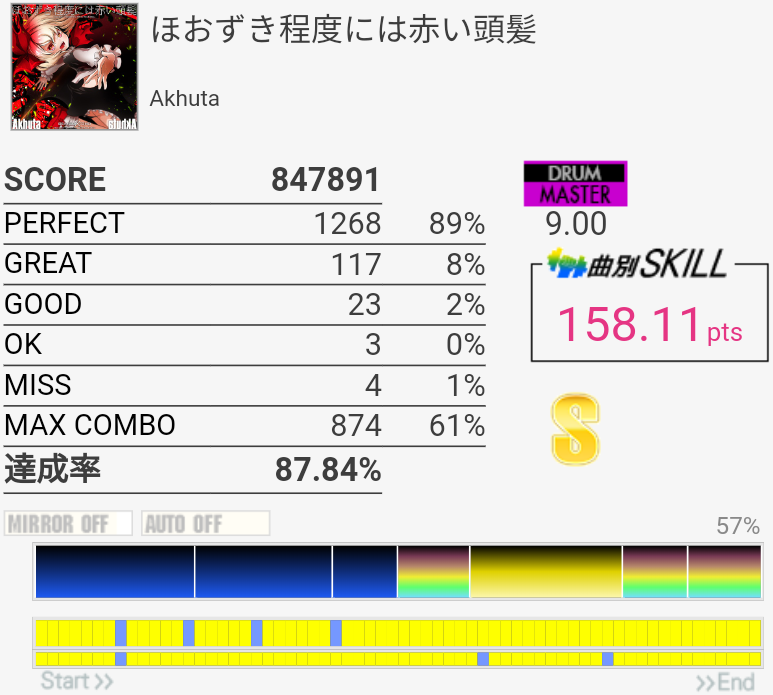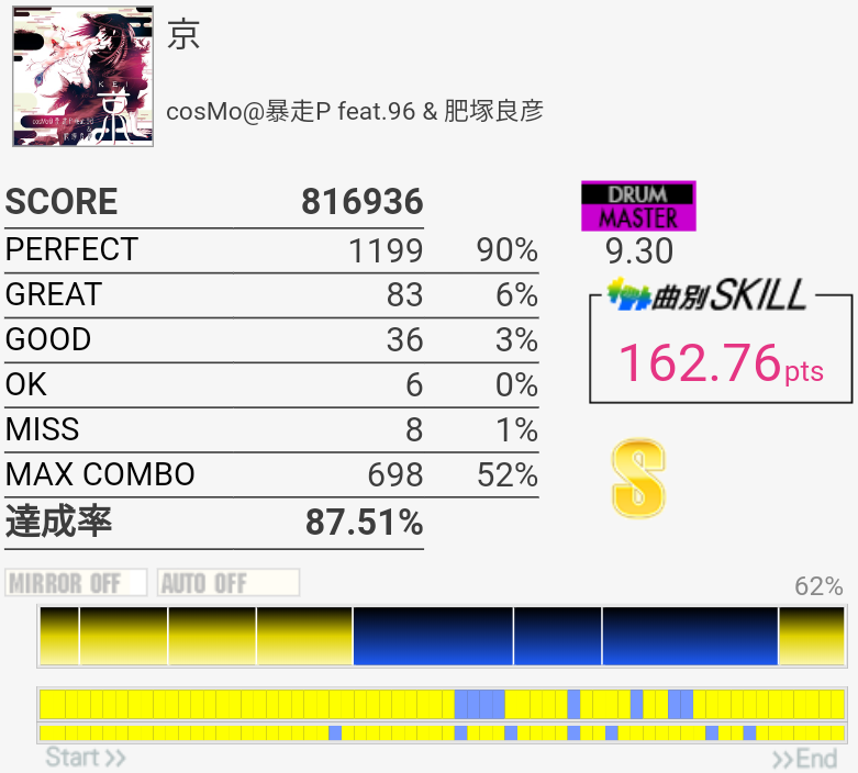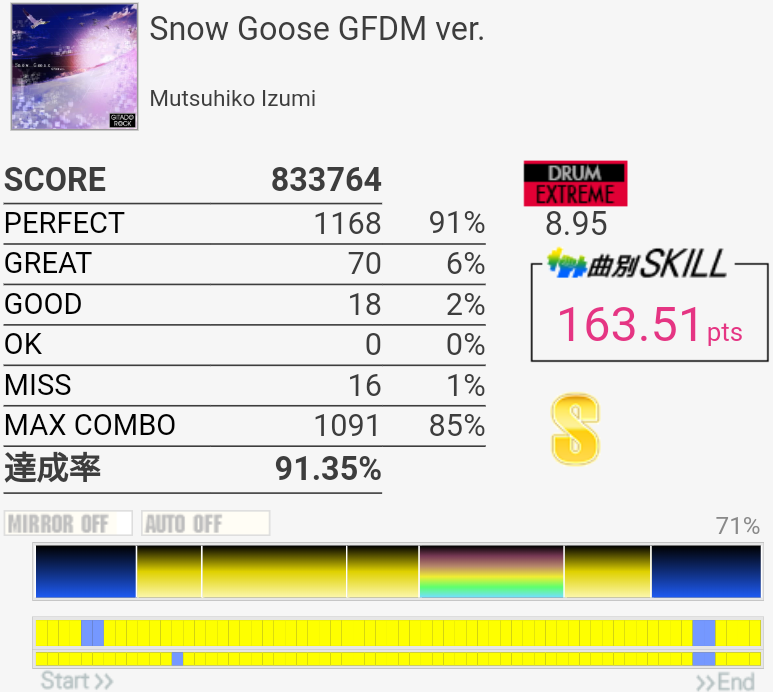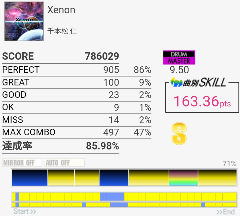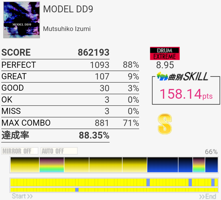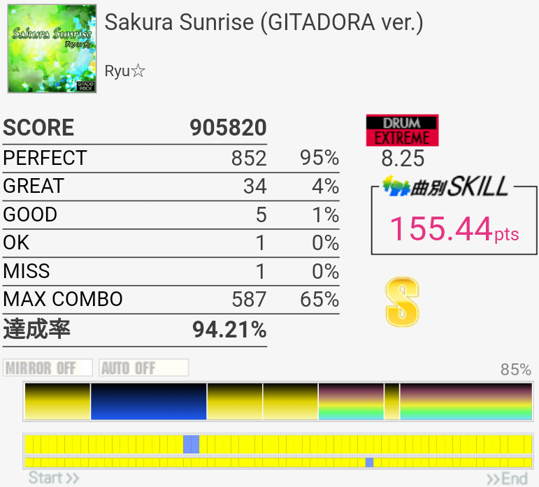 2フレーズ目の最初でCY多重反応した。どうせその後ミスってるしパフェ率お通夜だけど。ラストのSN×4→LT×2→FT×2がどうも苦手でLTにちゃんと手が伸びない。直後のHH+SNを意識しすぎてるのか、直前のCYからちゃんと戻れていないのか。