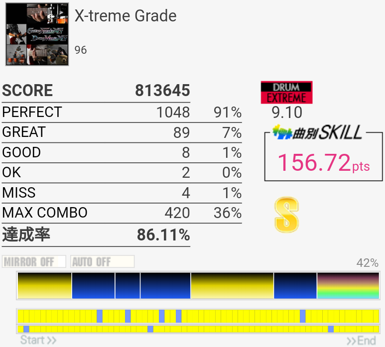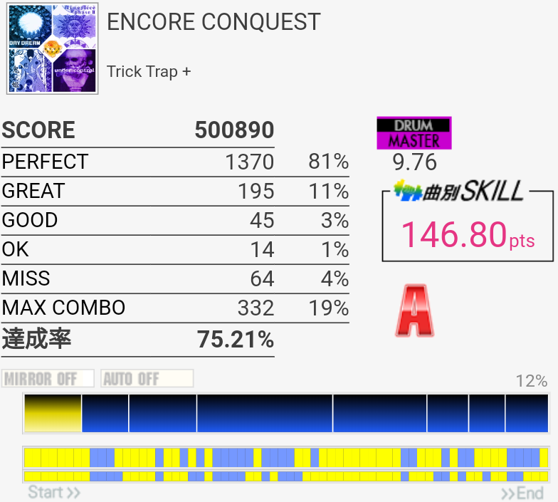 すごく久しぶりに5フレーズ目のブレイク繋がった。この曲なんかツーバスの速さが合わない。