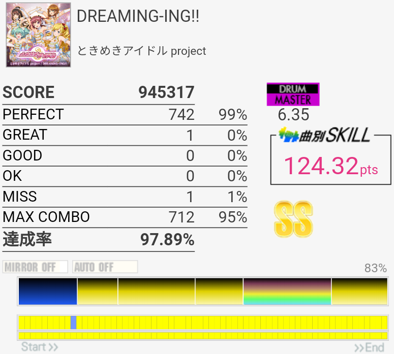 BPが謎抜けした。どうせAメロ入りのHHでGREAT出したんだけど……「友情パワー」とサビ前でGREAT出ないのめったにないからすごく凹む。