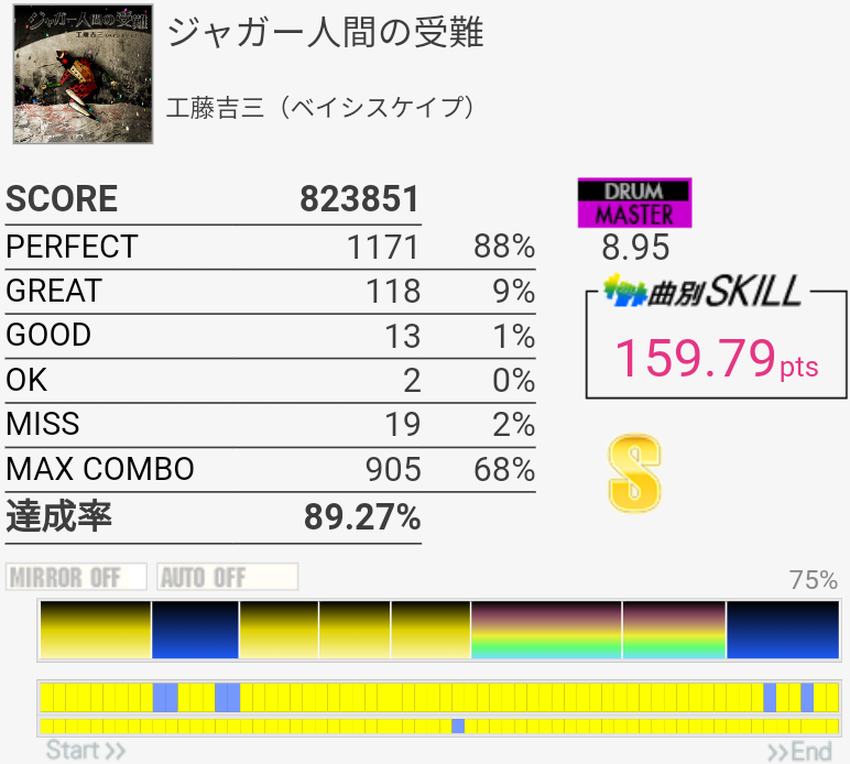すげーもったいない切り方したー!って前にも同じことしてるのかよ!あそこのシンバル振り回し→タム→左手LCのところよくわかってないから毎回手が動くようにお祈りしてるんだよな。ダメでしょ。