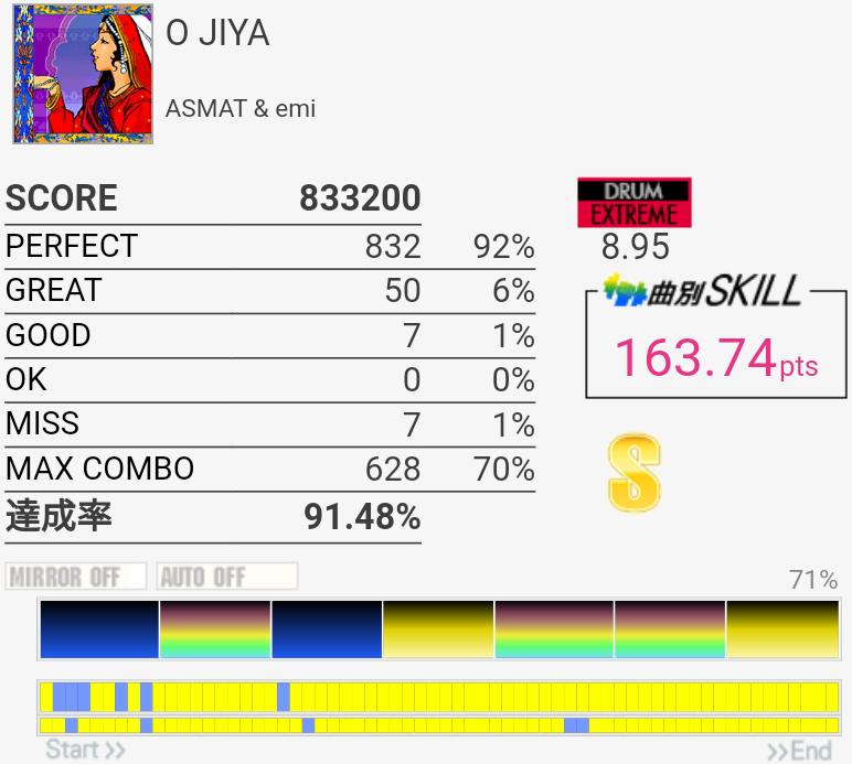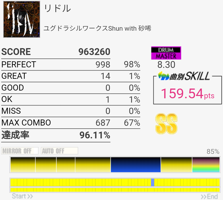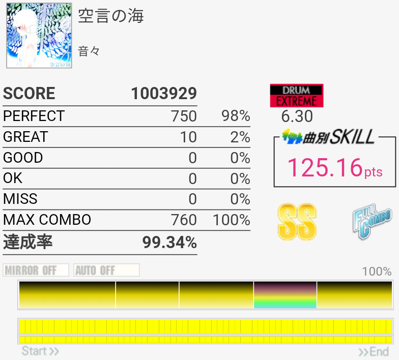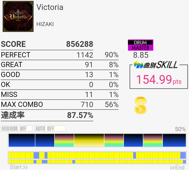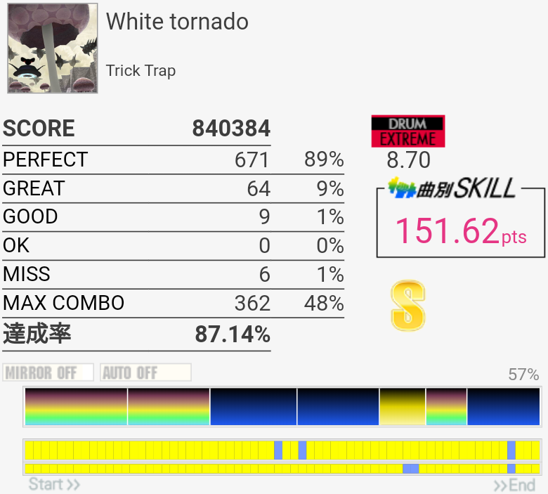 これも6フレーズ目はSN無反応で切れた。この曲ってラストのクソ速タムだけフレーズ分かれてなかったっけ?記憶違いか。
