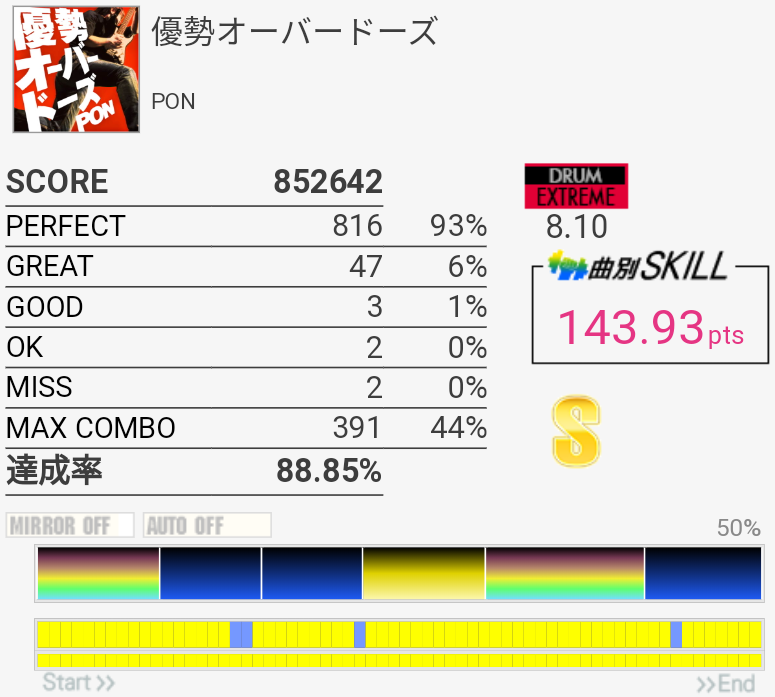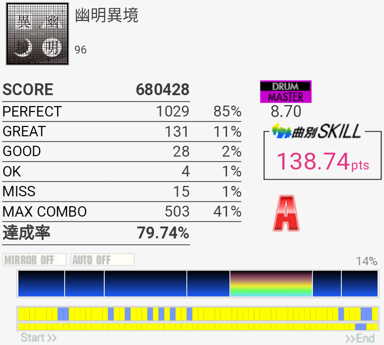 いくらなんでもA判定はないと思う。左手ダブル全然できなかったね。終盤の刻みが1クレ目でやるには速くて追いつかなかった感。ちょっと新年っぽさある?