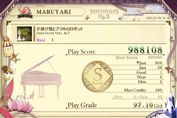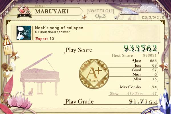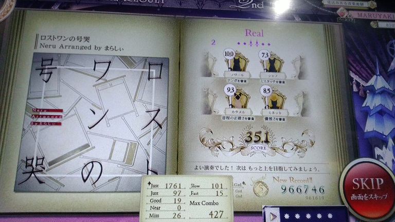 111.21点。イントロアウトロが捌けるようになると一気に稼げるね。
