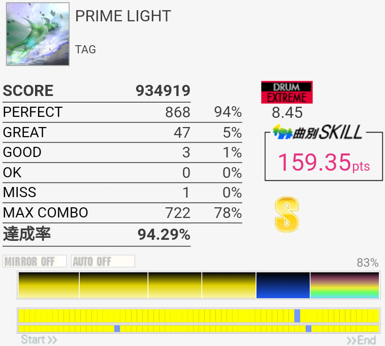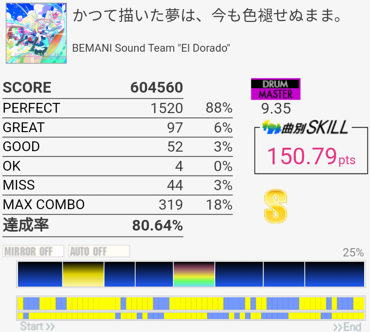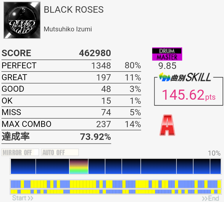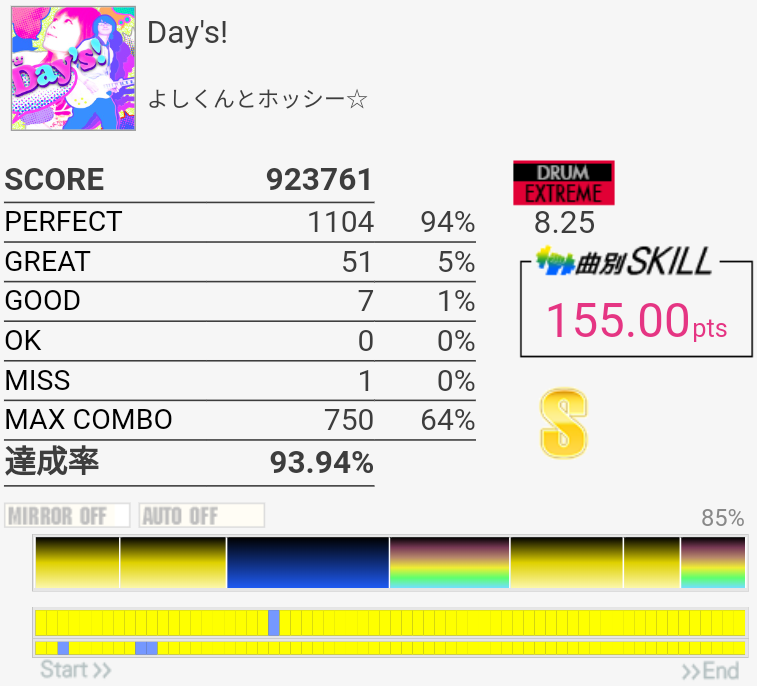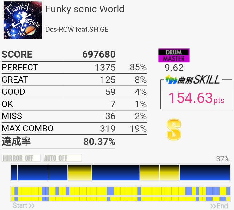 超久々にやったけどギリギリS取るのが精一杯とか……でもメーターを見るに前からこんなもんだったか?体力キツくてもちゃんと触るようにしないとどんどん刻みができなくなっていくな……。