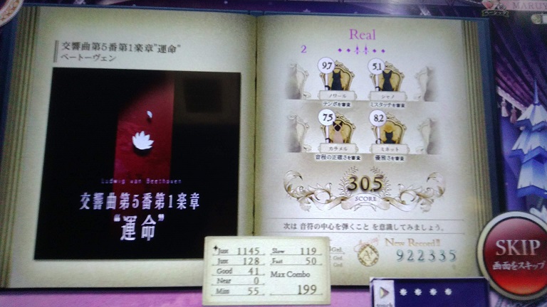 初見に厳しい譜面。最近のトレンドは縦連なの?Realはハマると立て直すの厳しいな……。クラシック曲でフルで知ってる数少ない曲だ。