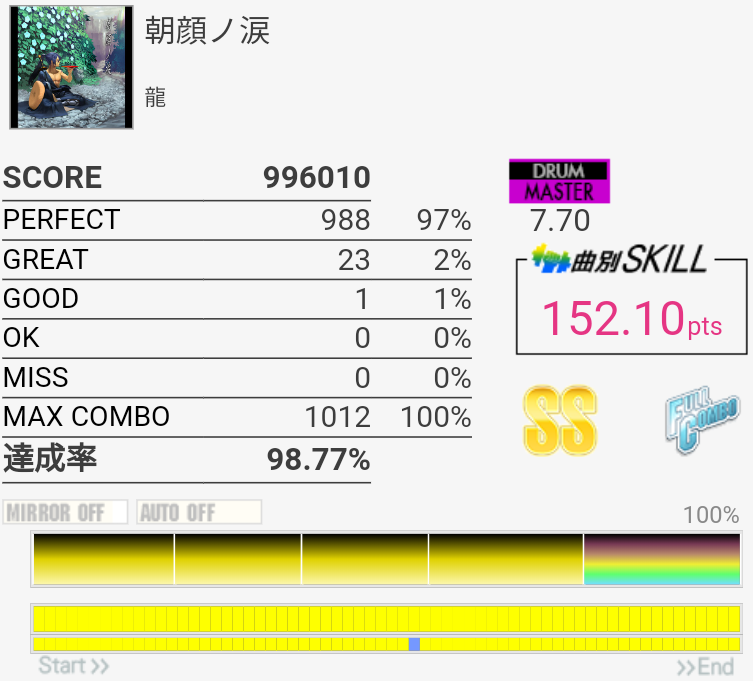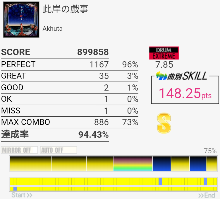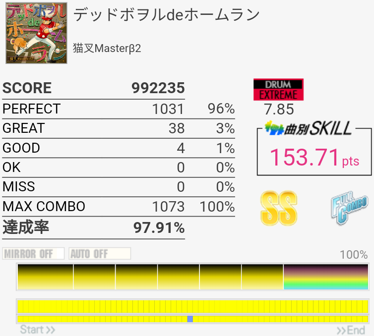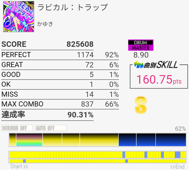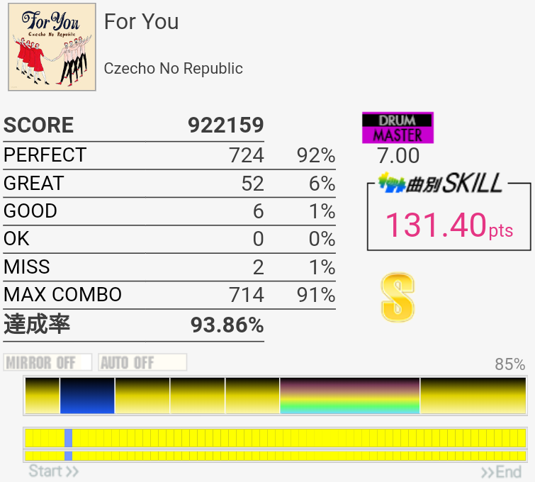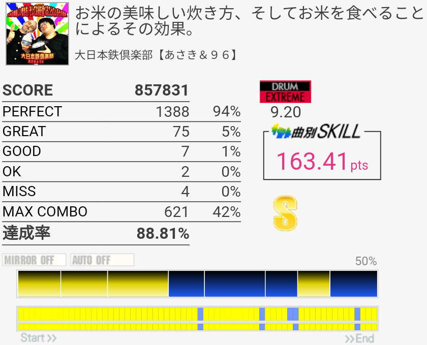 0.8%伸びた。ツーバス後半の入り方間違えて無理やり繋いだのでそれがなければ98%乗ってたかなあ。