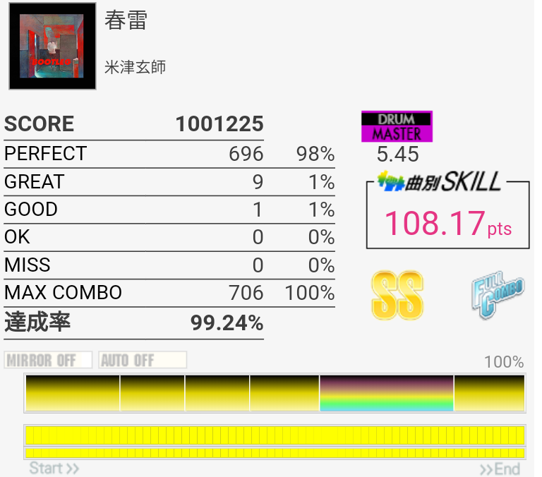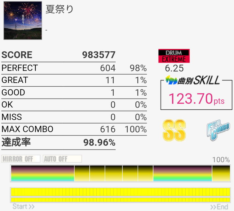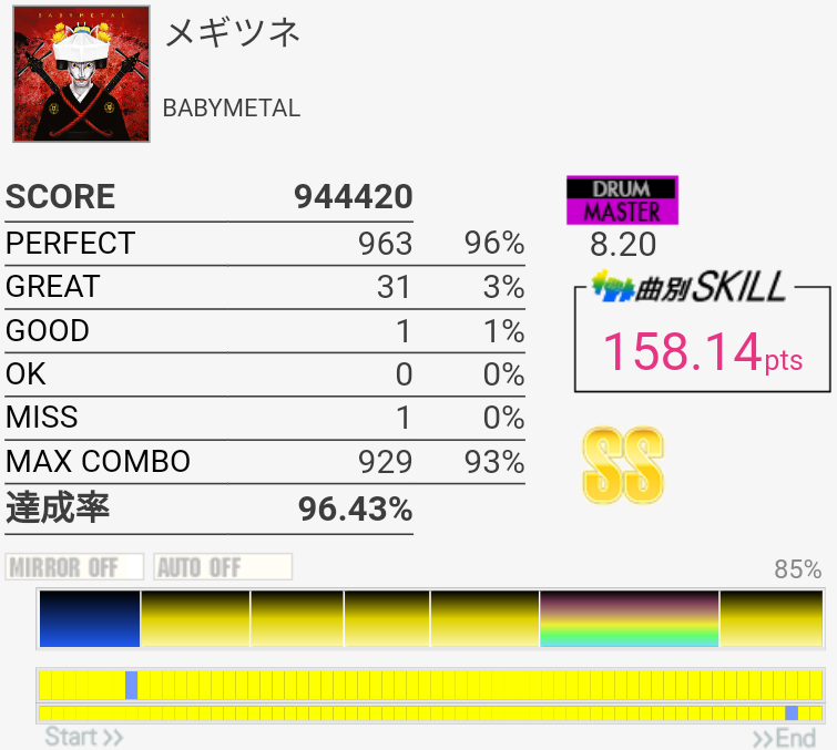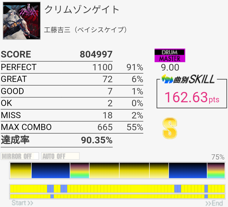 今日は比較的ツーバス踏める日だった。サビ終わりの2カ所がちゃんと取れれば170点取れるんじゃないかなあ。