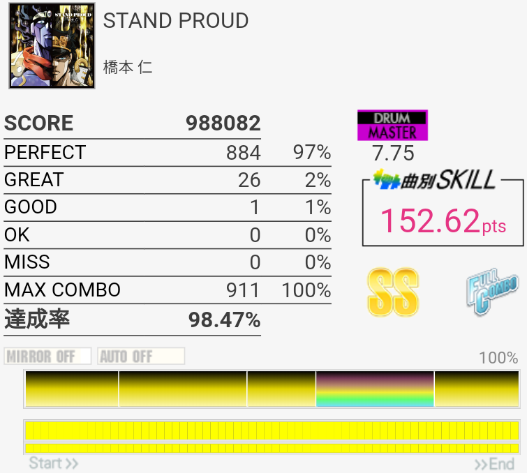 この曲の8分LPの感覚がどうもズレてて、8分裏のつもりで踏んでると比較的踏めてた気がする。よくわからん。