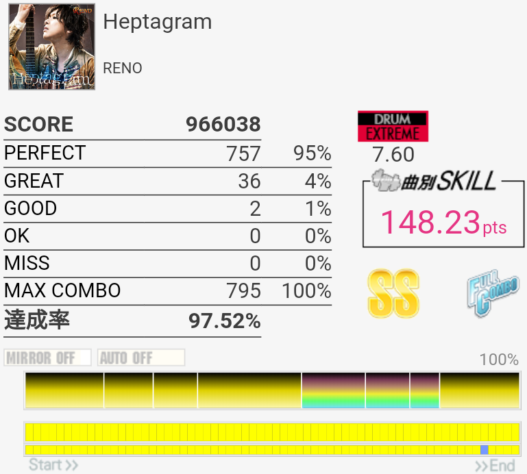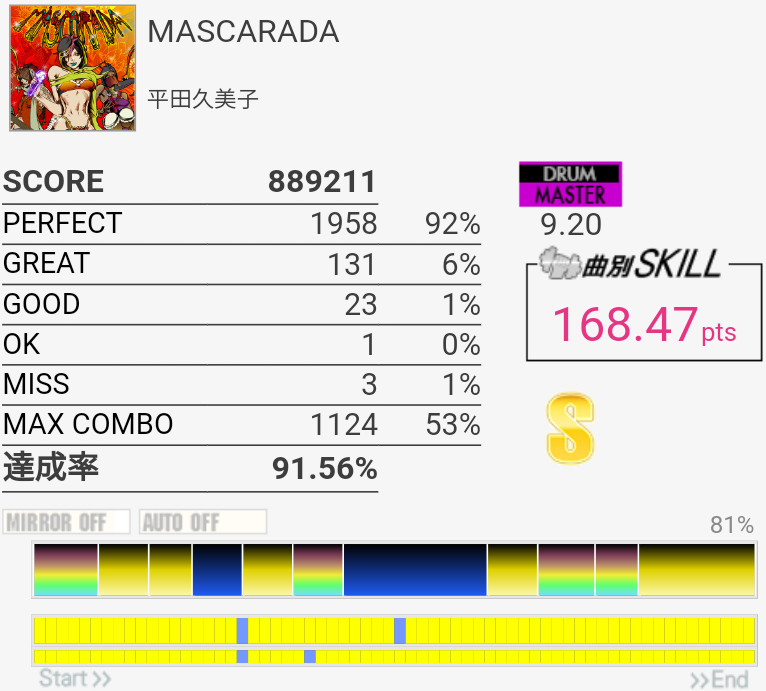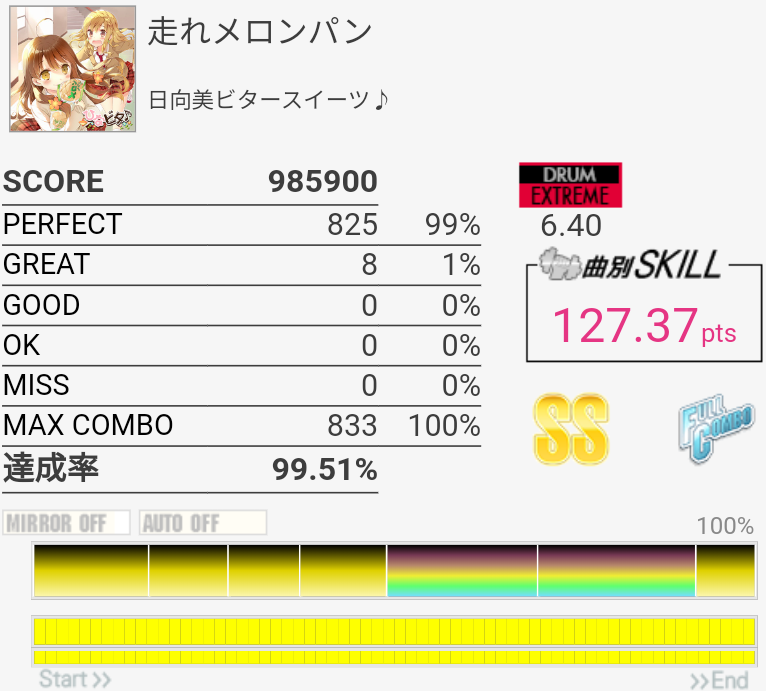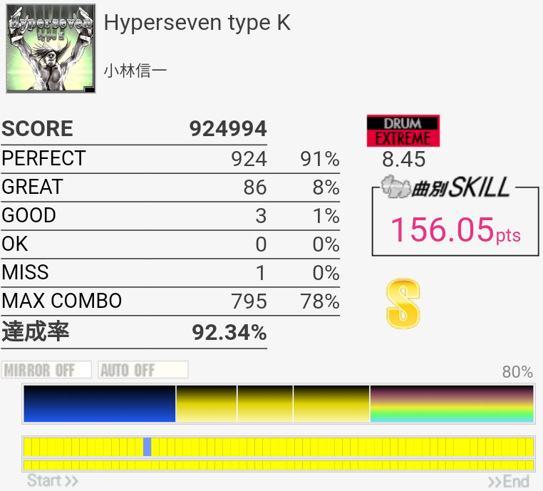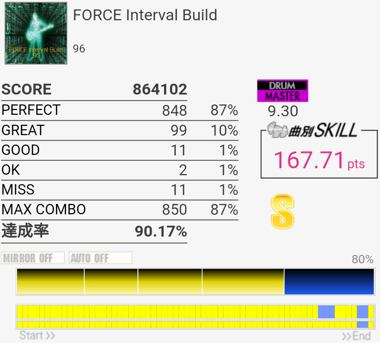 パフェ率がヤバい。序盤の左手でHH叩いてタム叩くところのリズムがよくわかってなくて毎回全部GREAT以下になるのでヤバい。