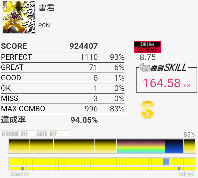 なんか急に繋がった。SN連打はよくわかんないので三連符→16分で叩いたら繋がった。そのあとのLP部分がズレズレでパフェ率ガタ落ちしたのが悔やまれるけど。