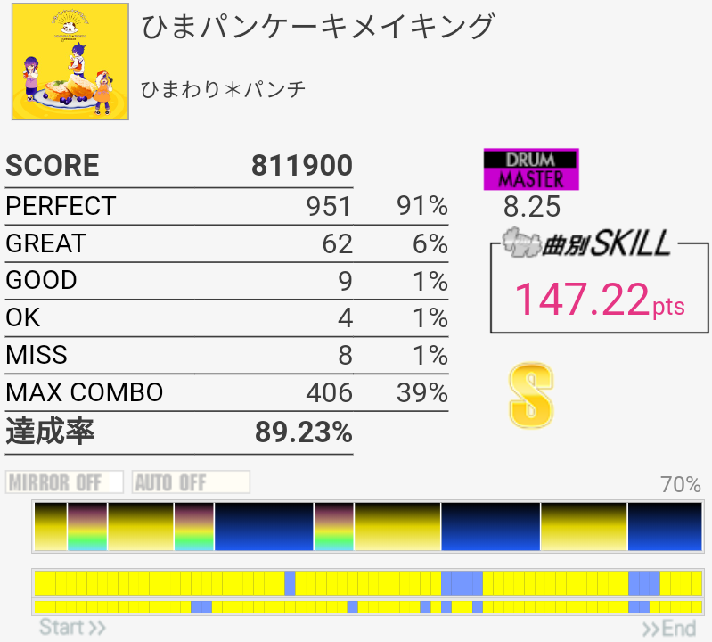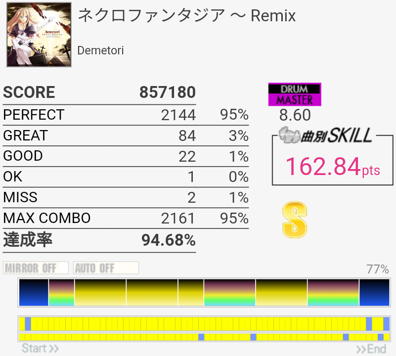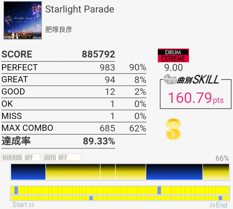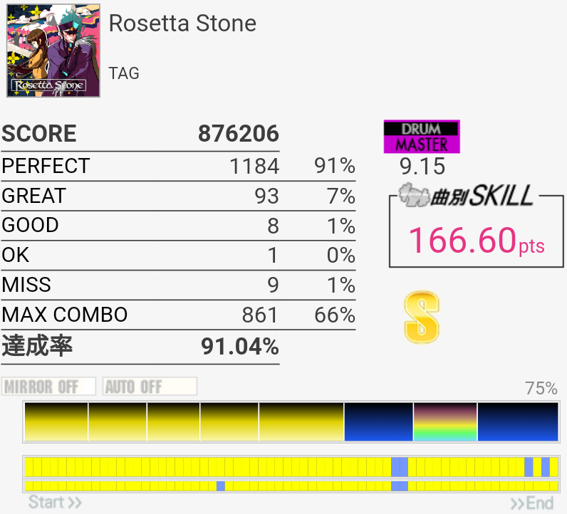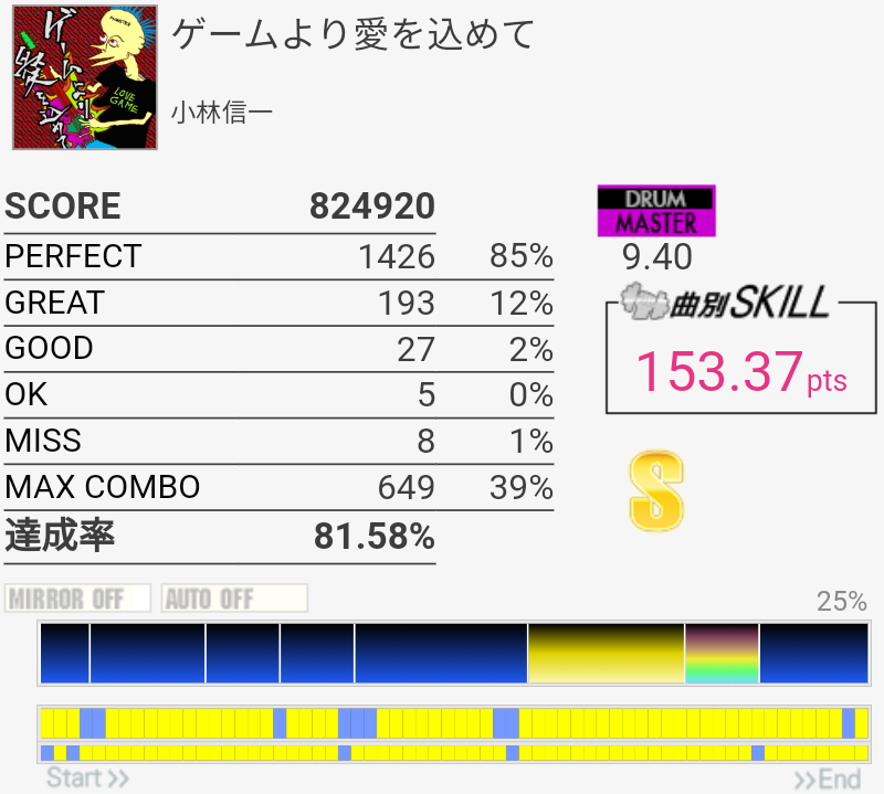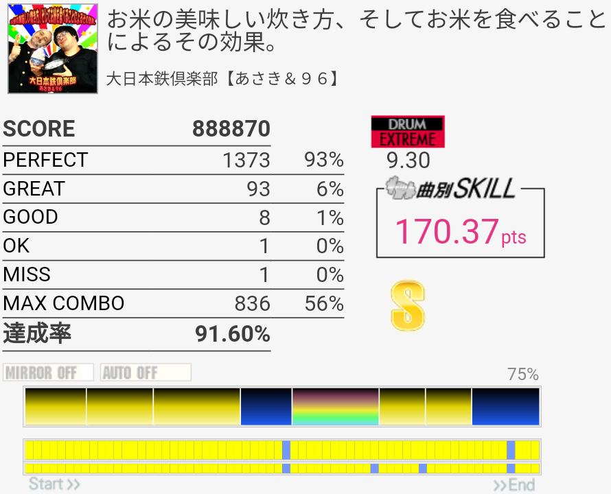 8フレーズ目と最後は一生叩ける気がしないね。せめて150点は取りたいが……。