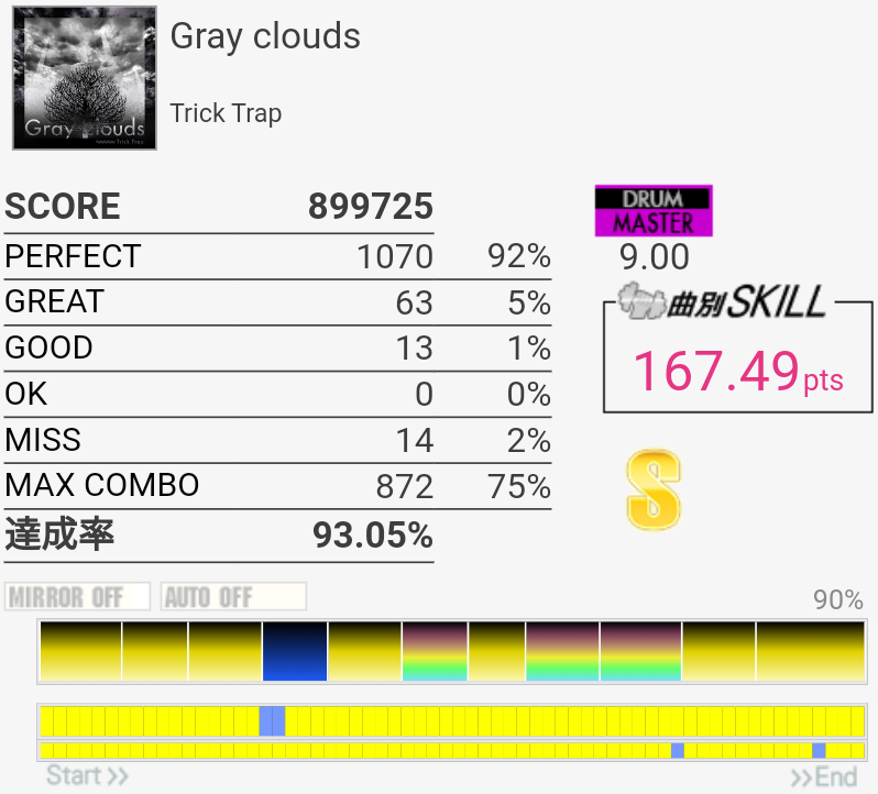 ラスト苦手すぎる。この時は判定が合わない原因がわからなくて判定タイミングを表示していたけれど見づらくて画面の上の方見てた。逆効果じゃないかな。