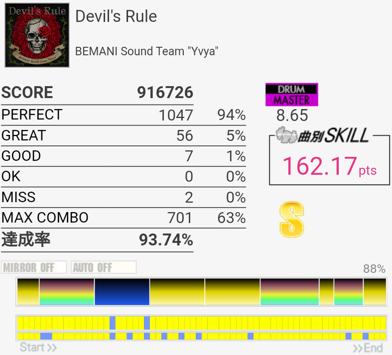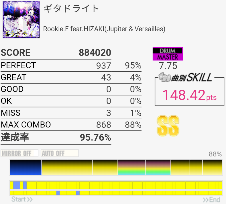 SS取得。最初以外あんまり覚えてなかったけどなんか叩けた。クソ速SN連打が2回とも繋がったの奇跡的だね!最初のBP踏めなかったけどGOOD出てないし満足。この曲初出の難度値がおかしかっただけで実は良曲良譜面なのでは……?