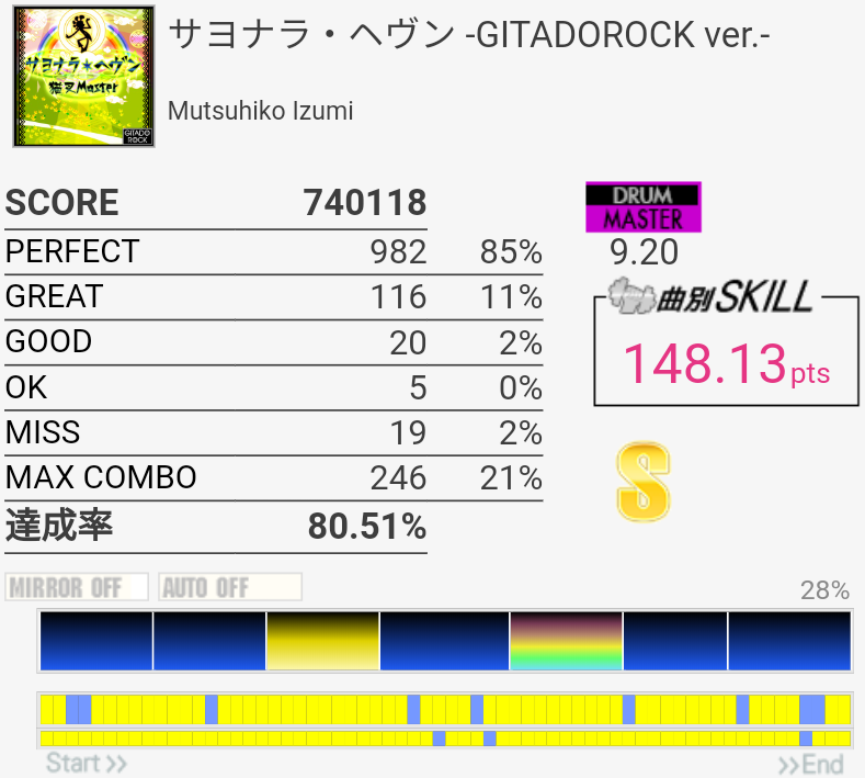初見でめっちゃ混乱した。曲オシャレだし譜面楽しいね!毎回切る部分が2か所あって、一個目は3フレーズ目の三連符SN→SN×4→LT×4→FT×2でここがクソ速い。Yvyaの譜面はいつもそうだ。二個目は4フレーズ目終わりのHT×2→SN→LT×2→SN→FT×2のところ、これはたぶんタムをダブルで取るんだろうけどHTダブルが超苦手なのでRLL→RRL→RRで取ろうとして8割切ってる。
