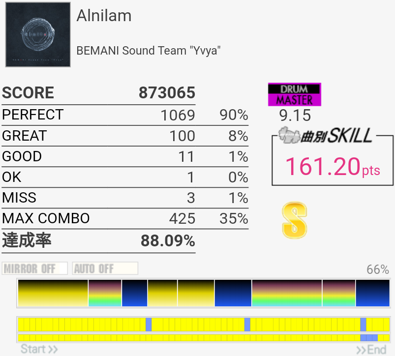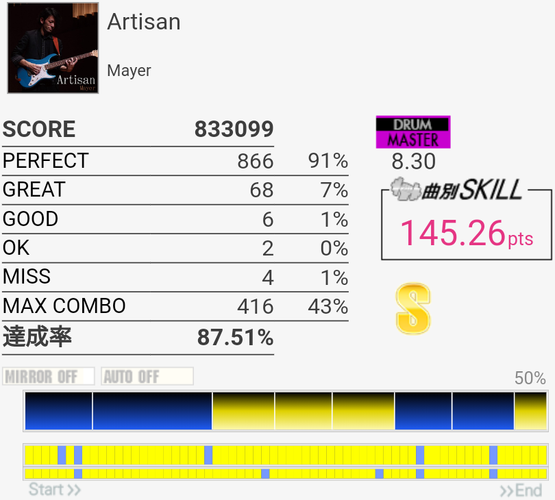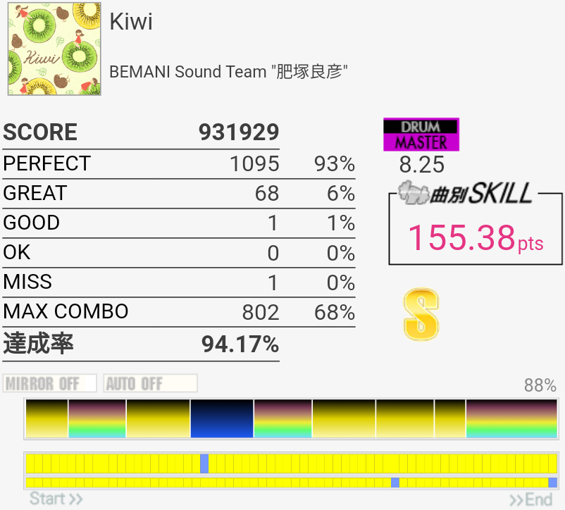 中盤のSN→LT→FT×2を毎回忘れてて叩けない……ラストはリズム覚えてきて今回はSN打ち損じで切っただけだったので大丈夫そう。繋ごう!