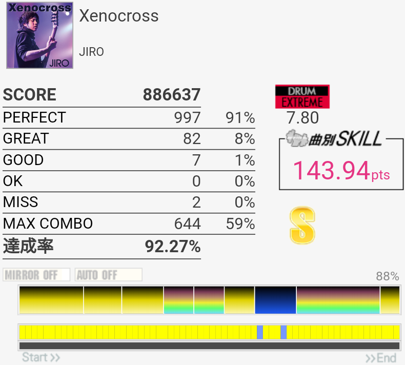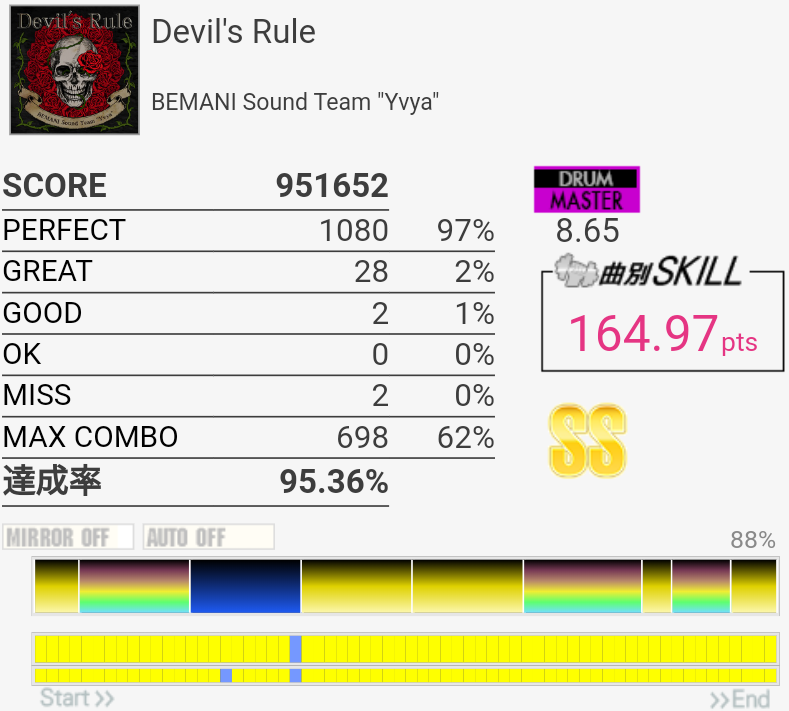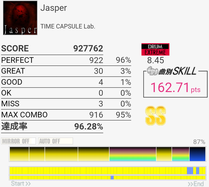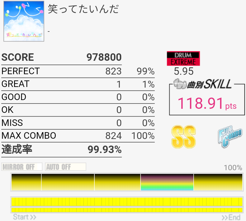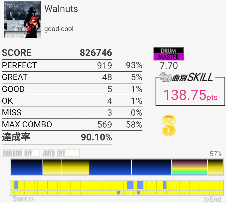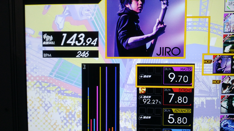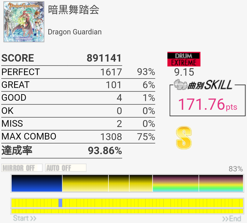 SS取得。いつも真ん中の速い2-2-2タムが叩けなかったんだけど、なんか今日は比較的タムが叩けた。最後忘れてて台無し。