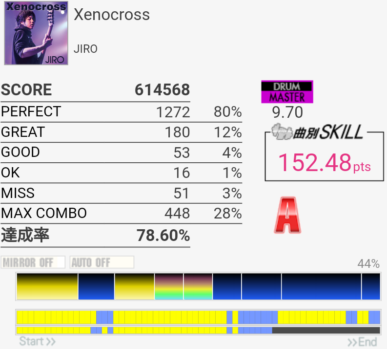 5フレーズ目繋がった!全部GREAT以下だったけど。6フレーズ目で変なミスしちゃったのが悔やまれるなー。