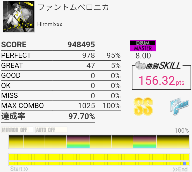 SS取得。7フレーズ目はよくわかんなかったけど何も考えず見たまま叩いてたら終盤まで繋がってた。というか前半も譜面を全然覚えていなかったのでタムをけっこう強引に取ってた。