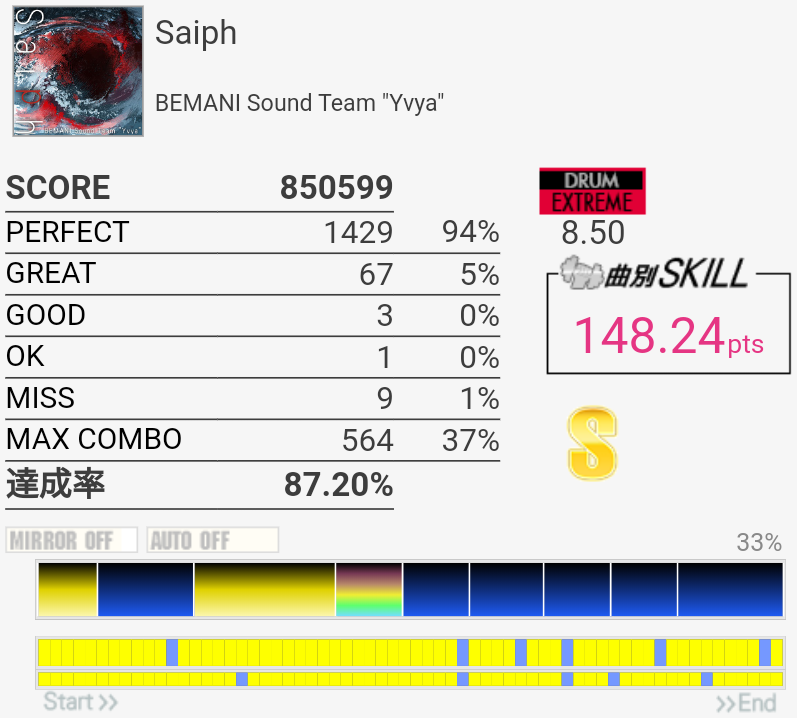 SS取れた譜面もフルコンじゃないのがなんというか、詰めが甘いというか。苦手な要素はあんまりできるようになってないんだよねー。