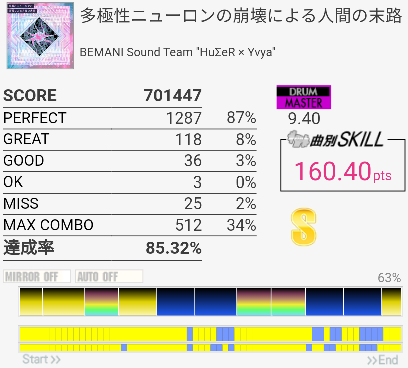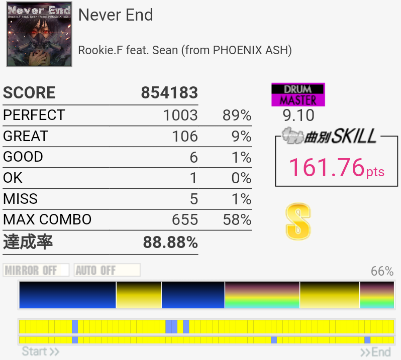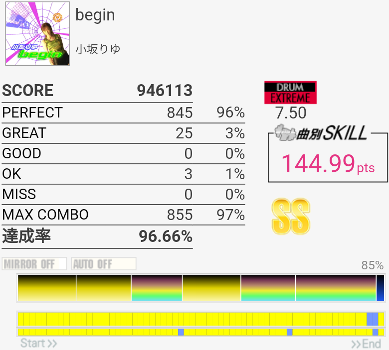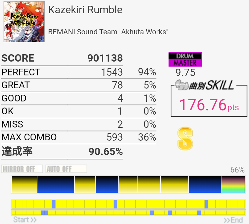 SS取得。今日いち嬉しかったリザルト。手順決めたりしてたわけじゃないのでHTはゴリ押しだけど、それもまた大事。
