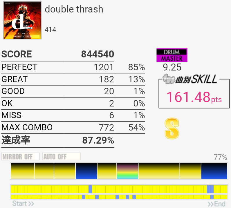 最近スキル上げを焦りすぎてイラついてるなーと途中で思ったので、並行して低難度値をパフェ率重視でやるなどしてたけどパッドが跳ねなさすぎてイラついた。