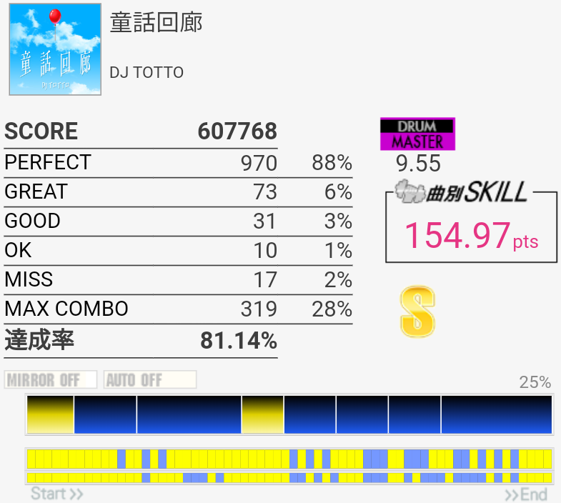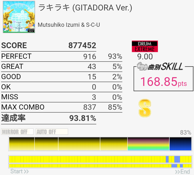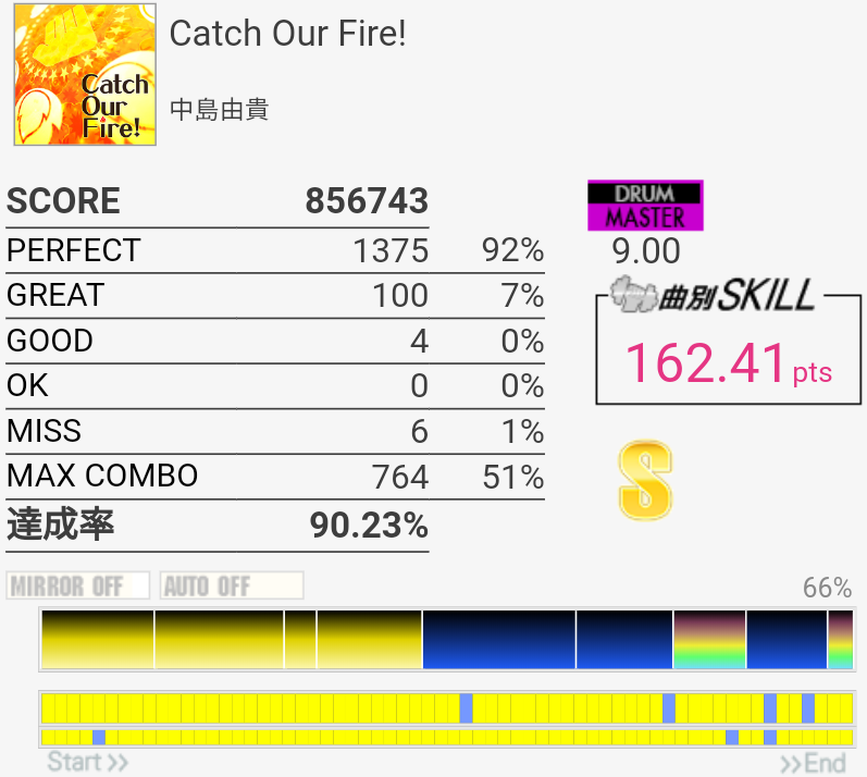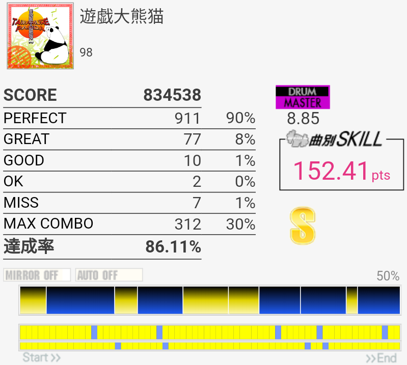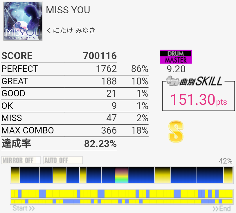 ちょい伸び。OKとMISSは全部パッドの反応がおかしかった(現地の言葉で「ちゃんとパッドを捉えて叩けなかった」の意味)。序盤のタムのところは全部左手ダブルでいいのね。