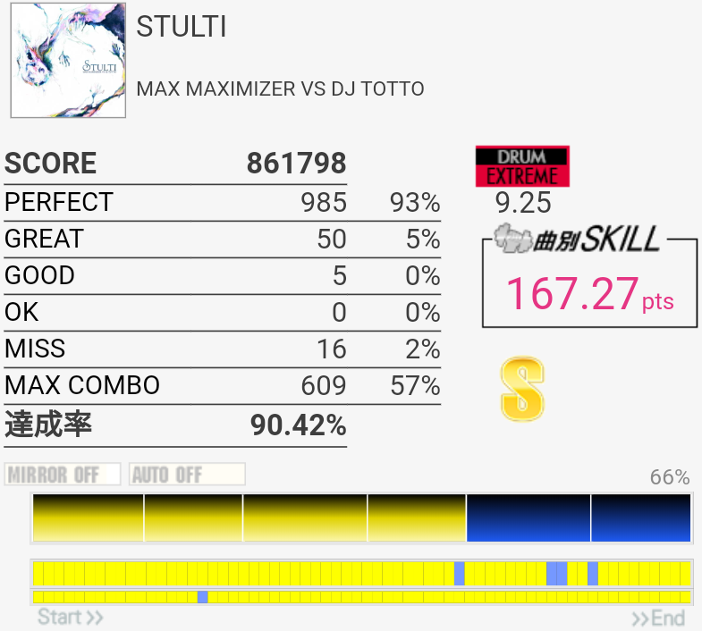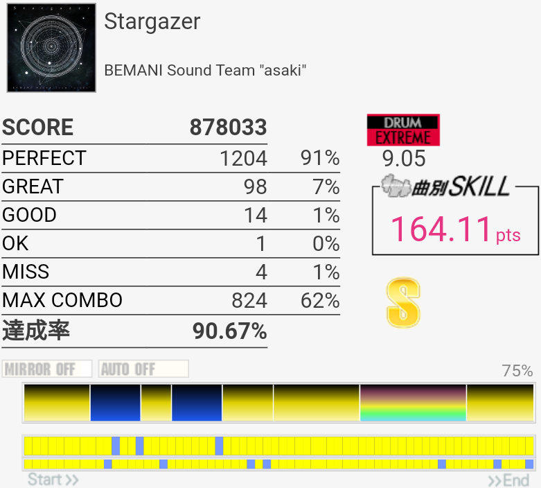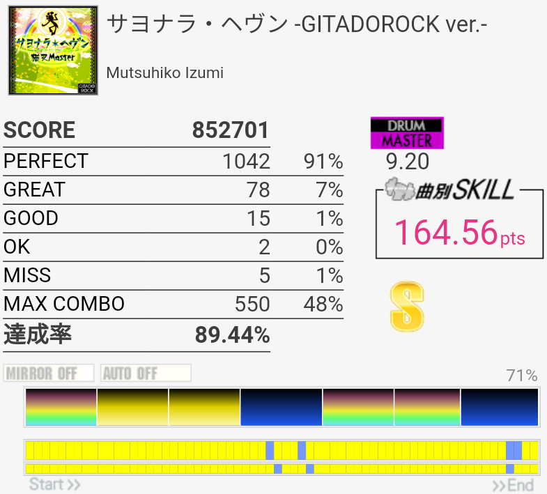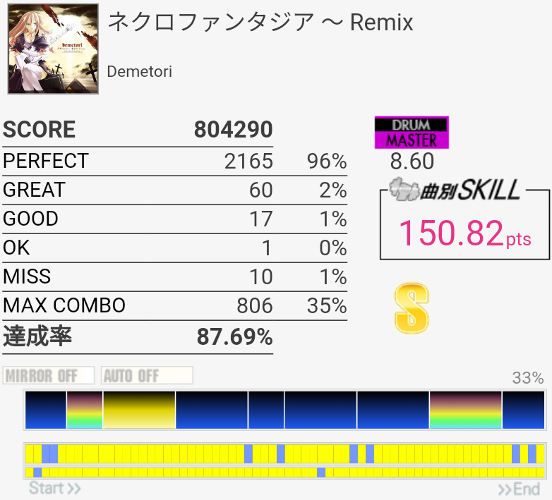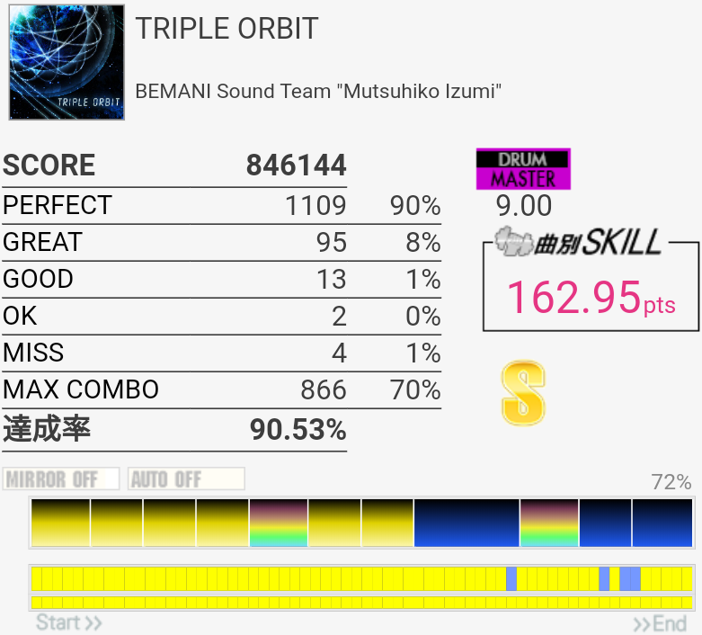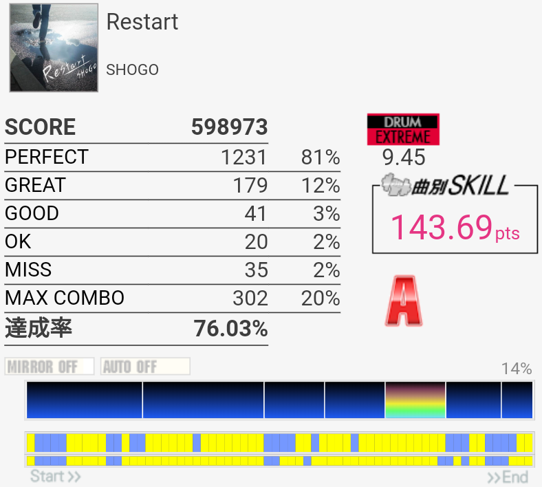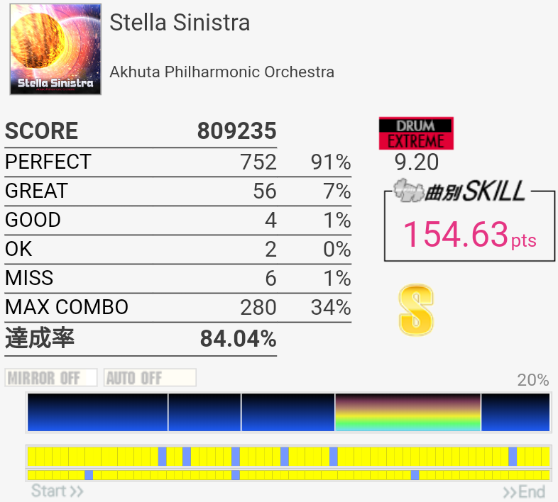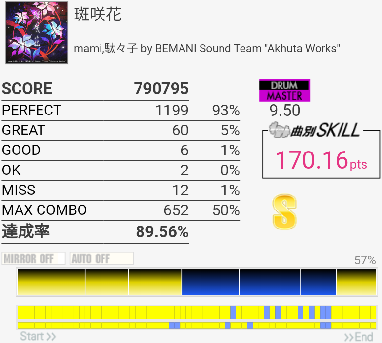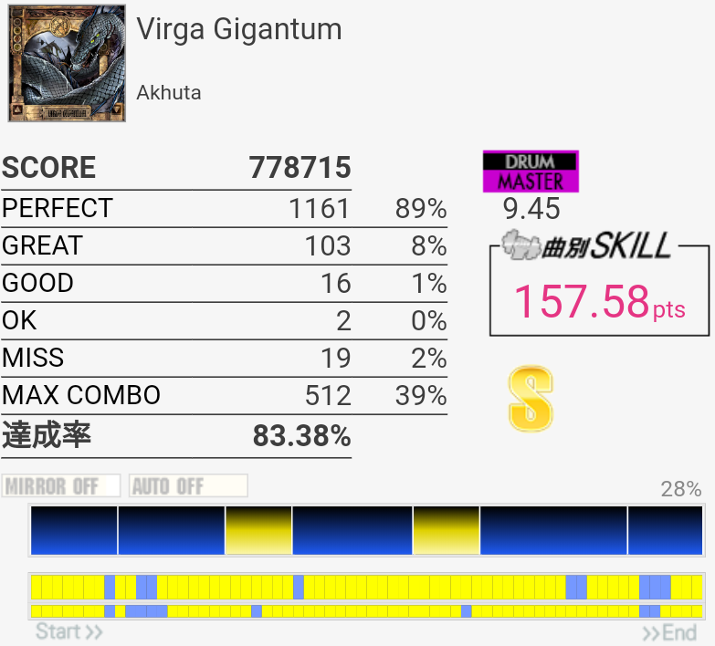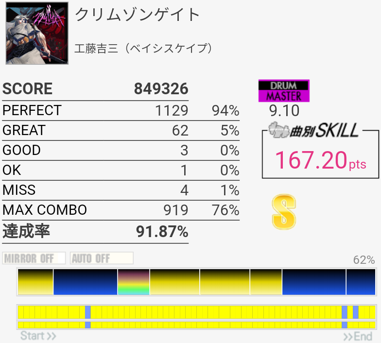 とりあえず170点。これサビは意識しだすとできなくなるな……!やっぱり速いCY刻みからフィルに入るのがつらい。