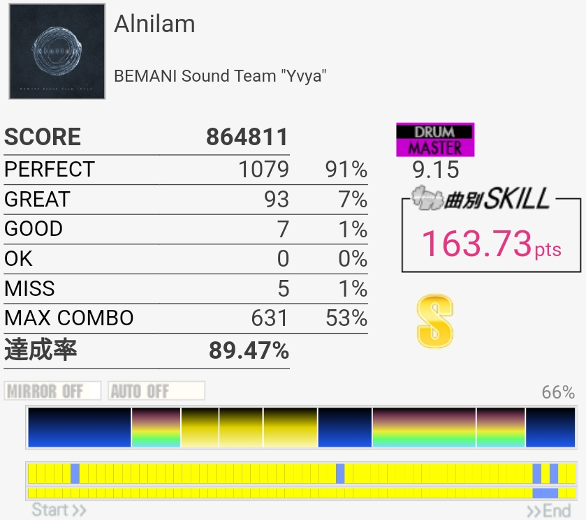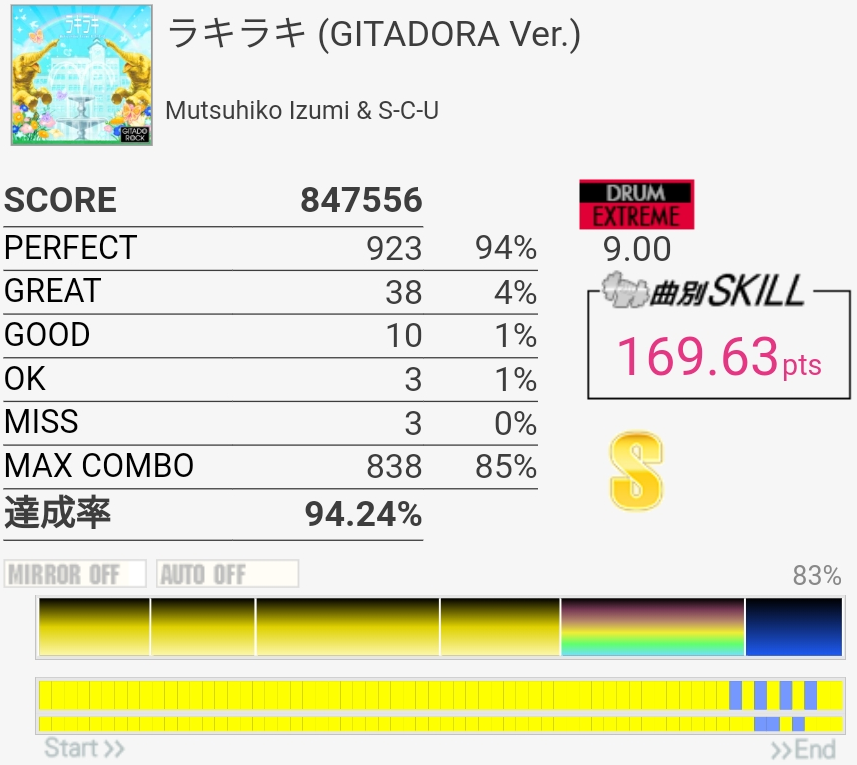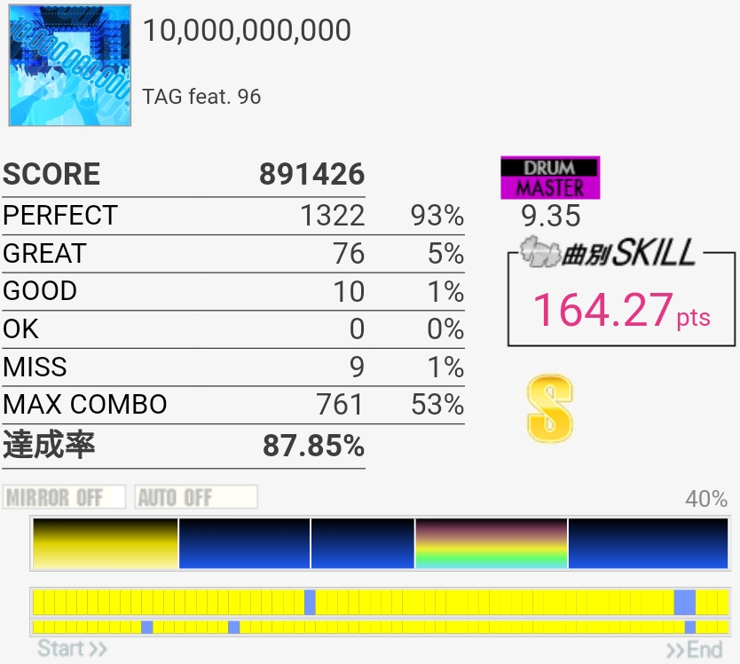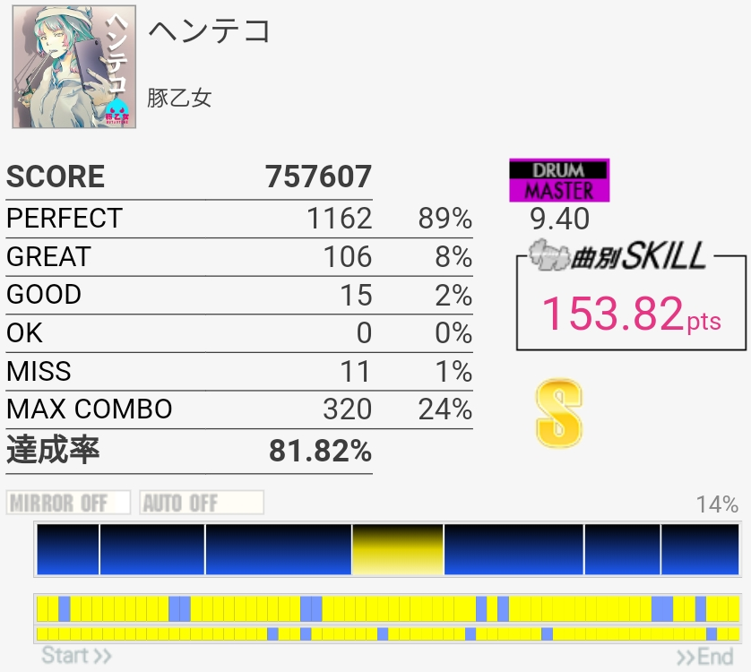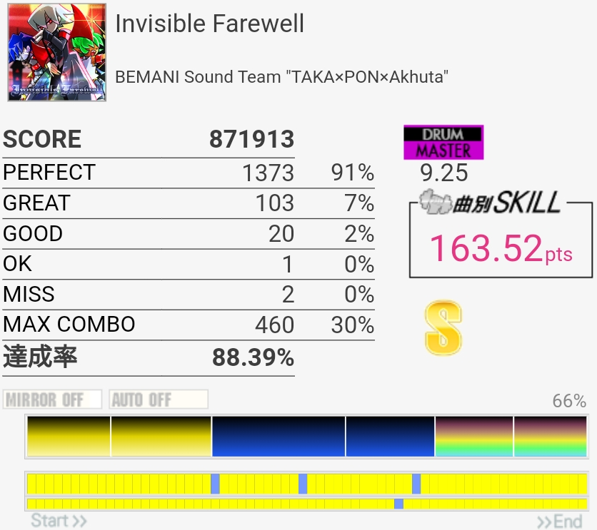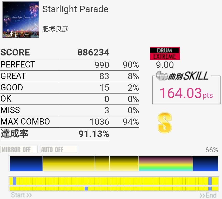 真ん中でスティック飛んだ。パフェ率もうちょい上げられれば170点あるかなあ。