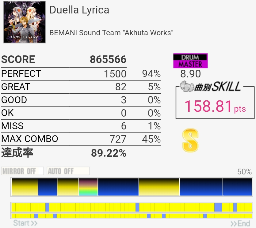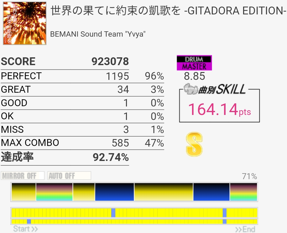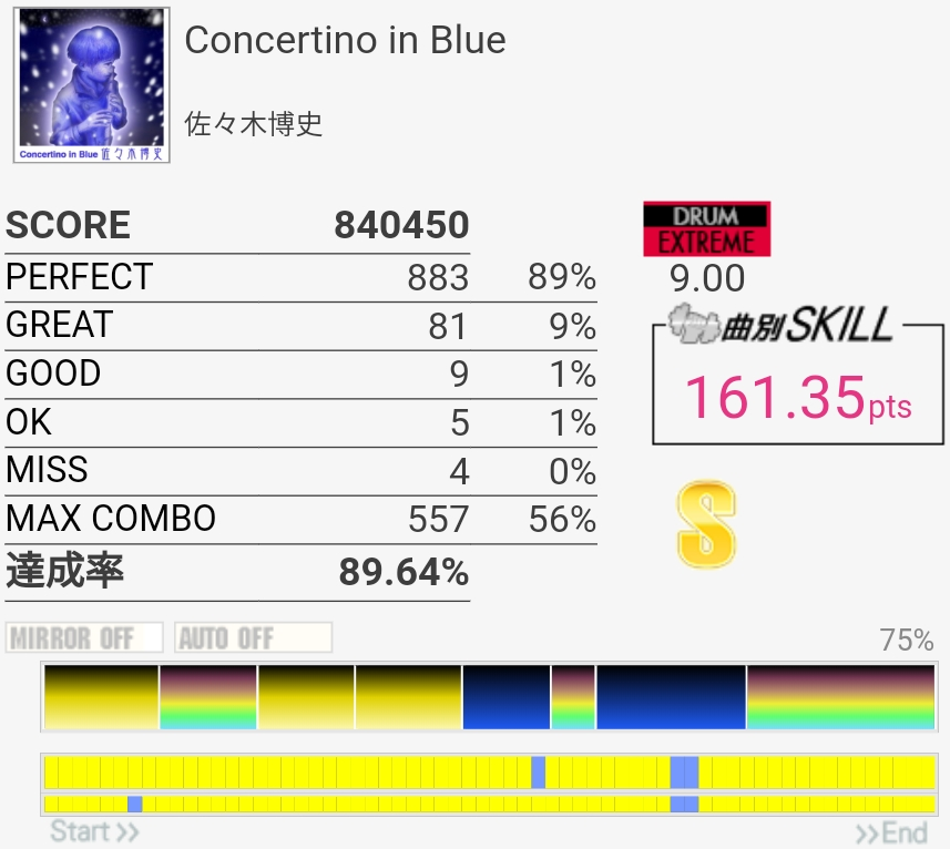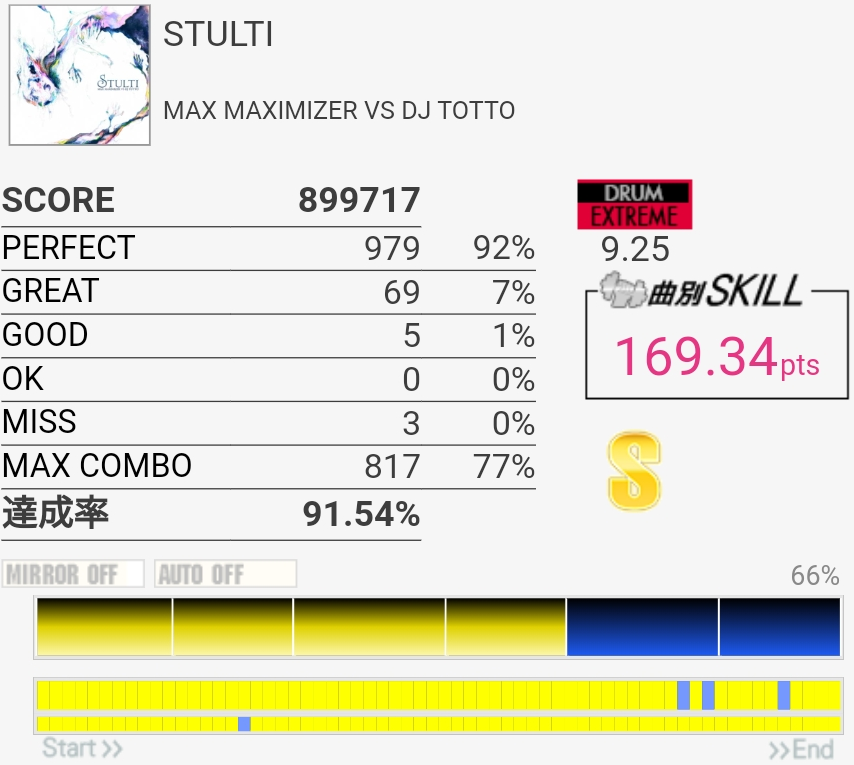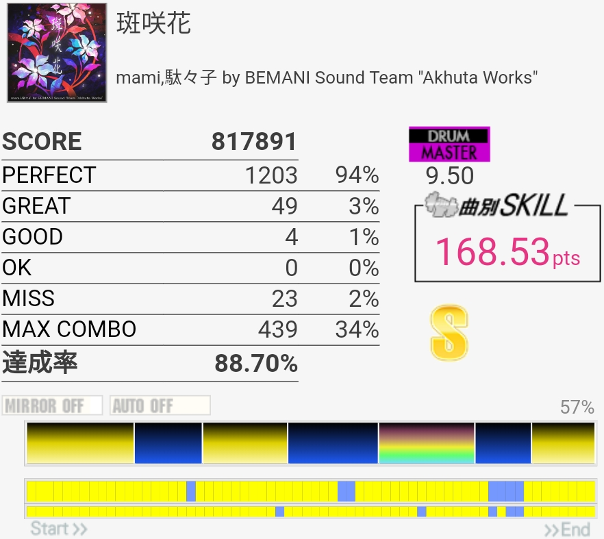 真ん中でスティック飛んだ。パフェ率もうちょい上げられれば170点あるかなあ。