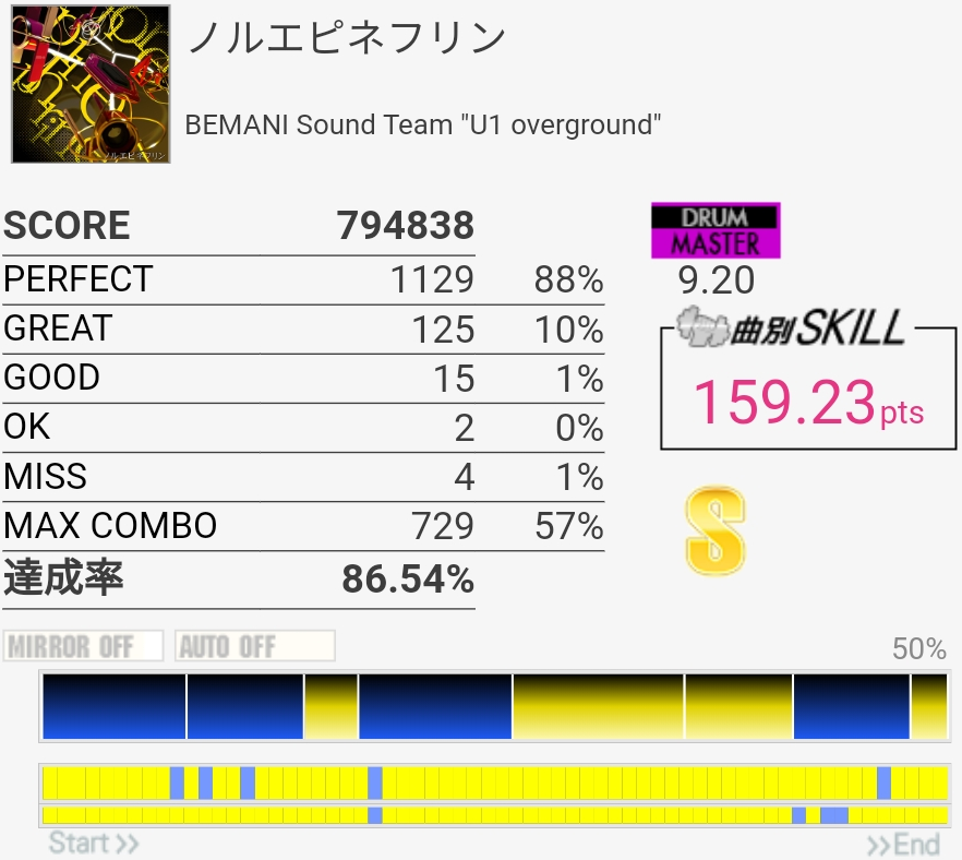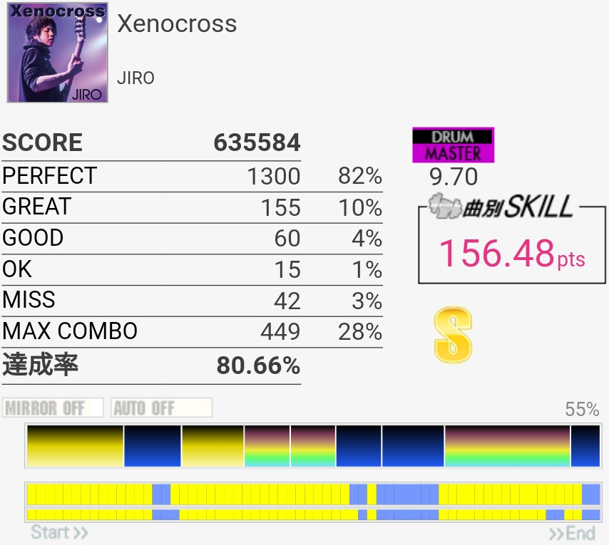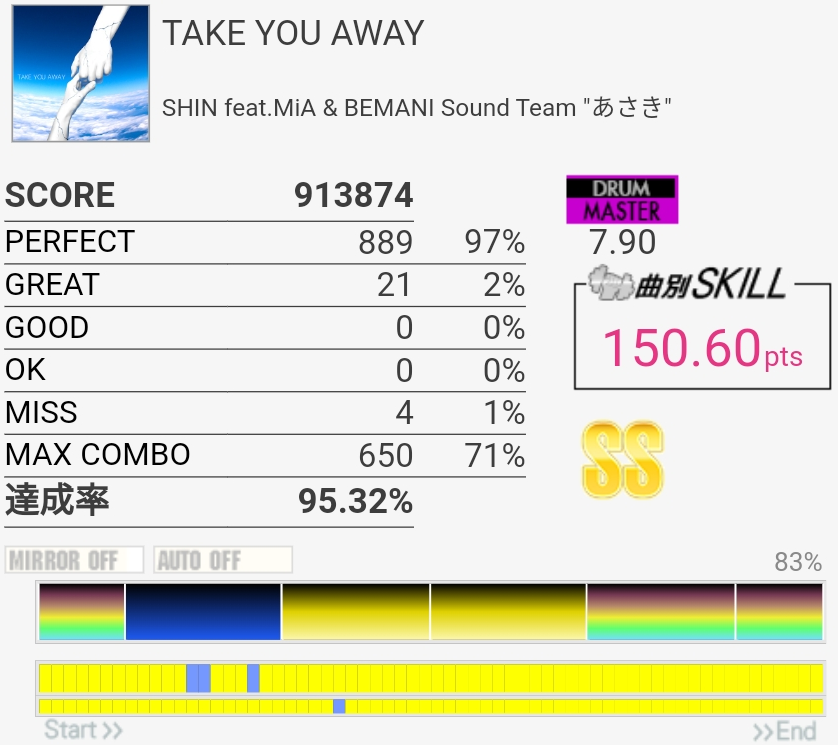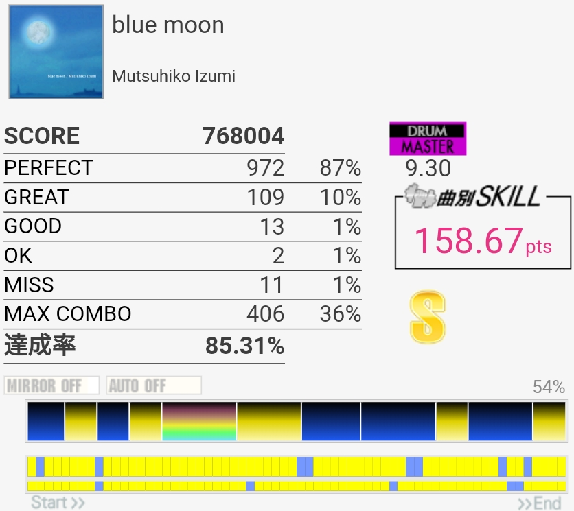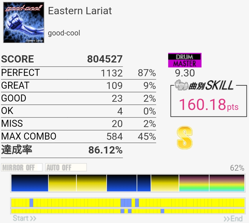 イントロ安定すればがんばれるかも……この曲をやってる途中でまたスティックにヒビが入って備え付けのスティックを使うことに。一週間くらいしか使ってないぞ。