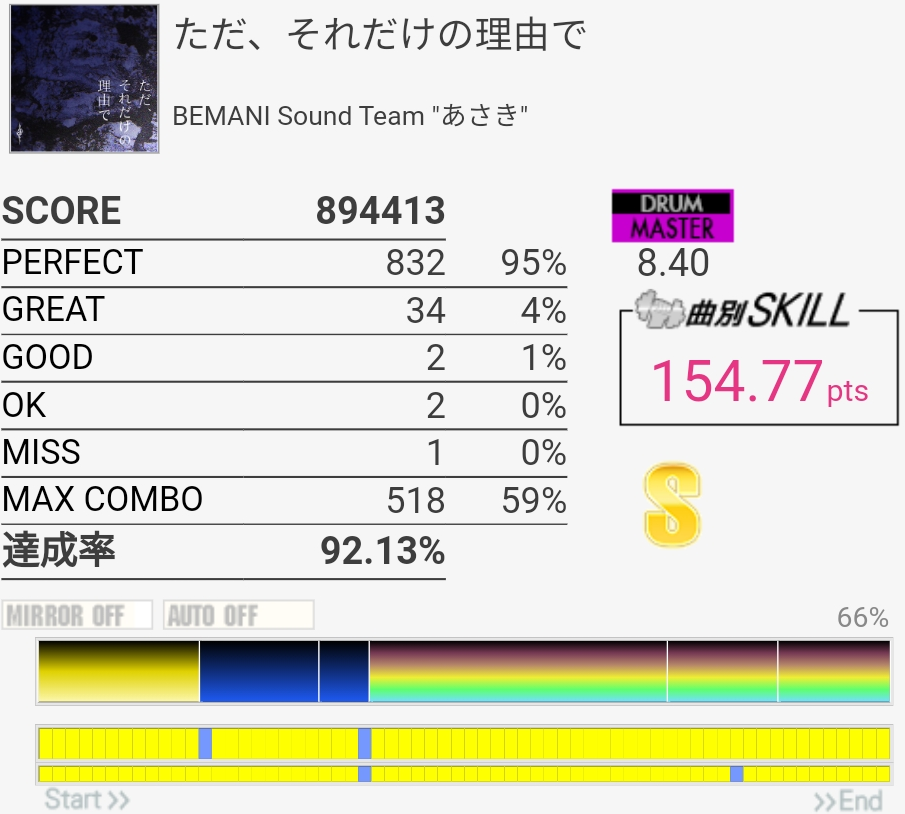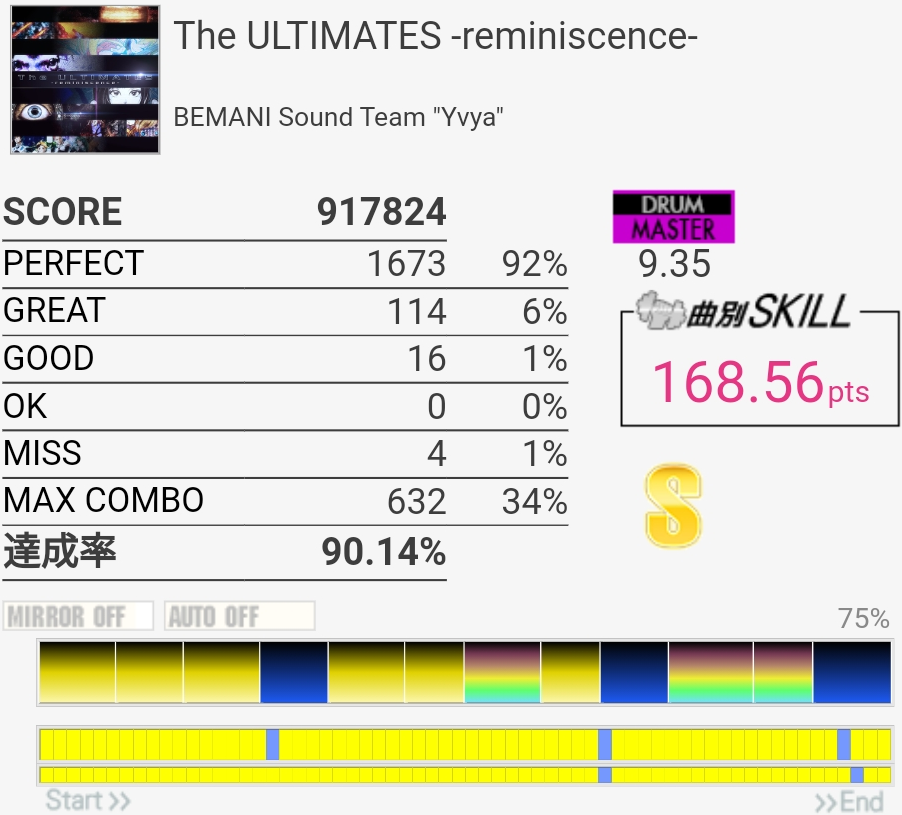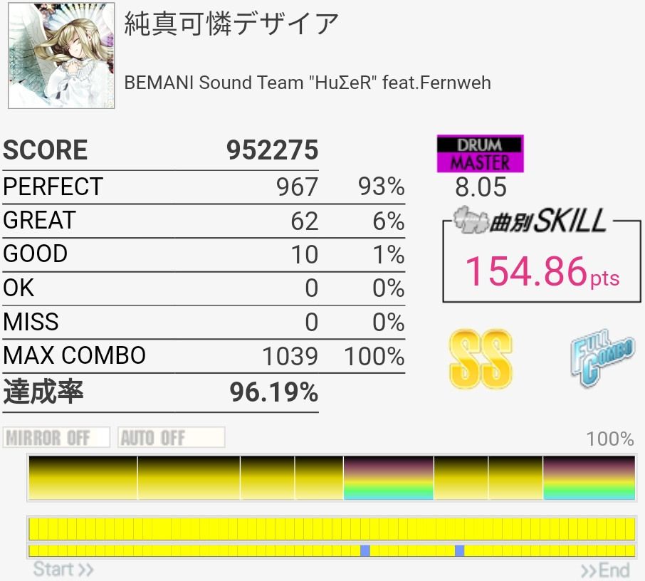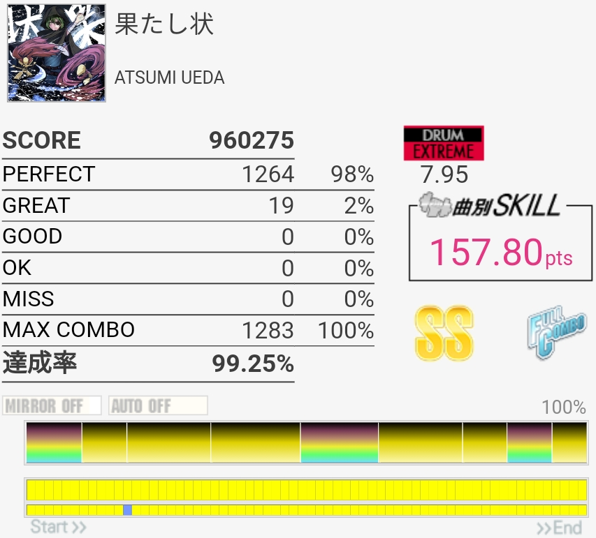 SS取得。最後完全に忘れてたな。そこ以外は落ち着いて譜面を見られたのでよかったかな。