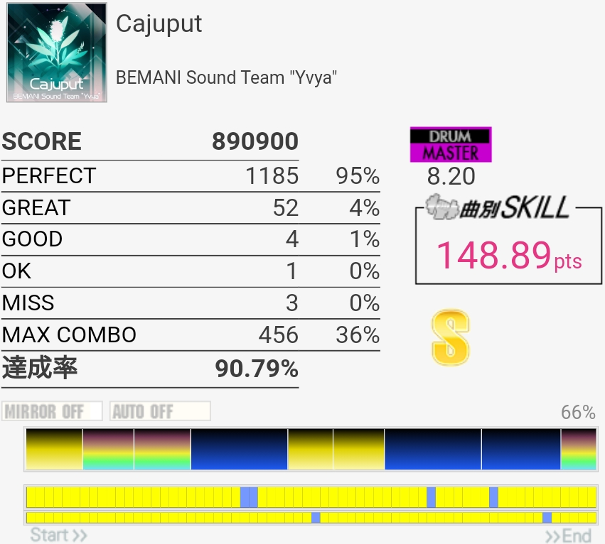 フルコン。新しいスティックがちょっと重いおかげでパッドを叩いた感触もよくわかるのでSNがバッチリ入った。GOODは全部右足だと思う、ペダルが踏みづらいのが悪い。