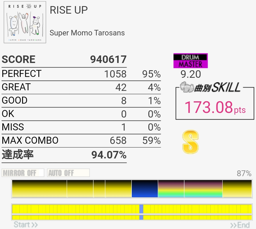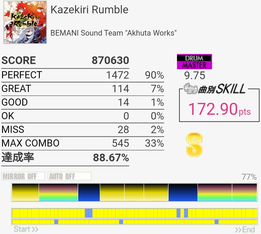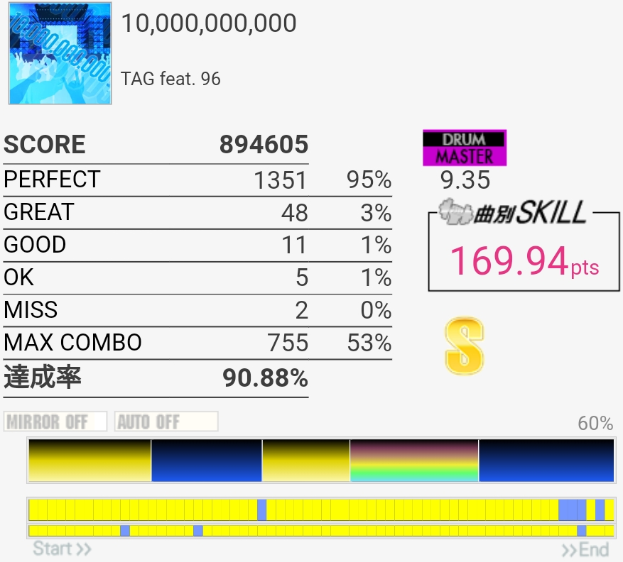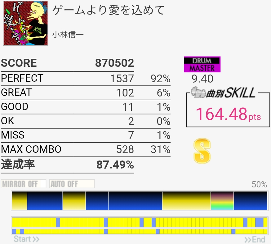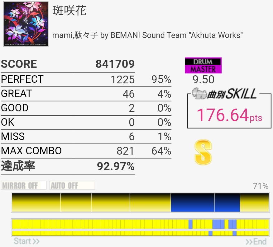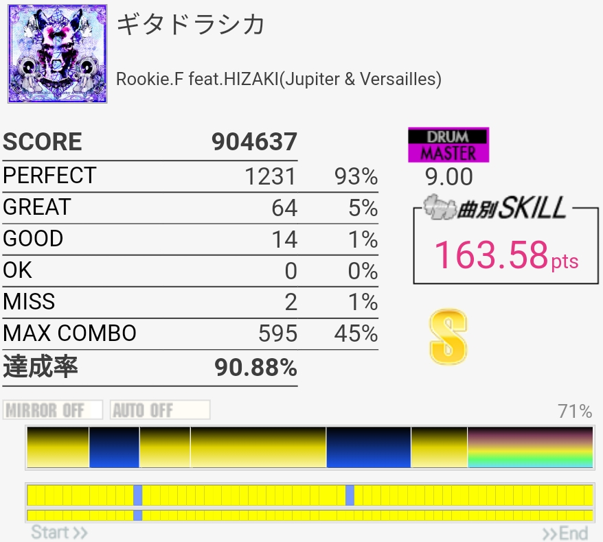 達成率0.3%、スキル0.5くらい伸びた。そう……イントロはけっこう繋がるようになってきたんだけどBメロのタム回し苦手なんだよなあ。LTかFTで左手を外してしまう。